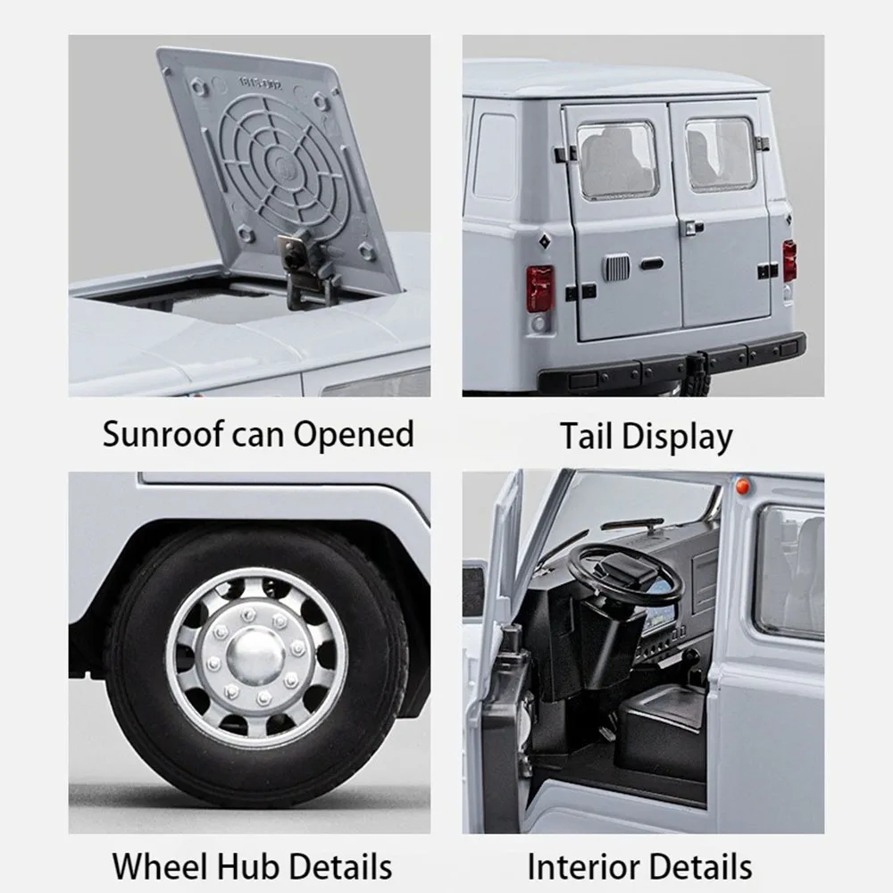 Imagine yourself owning this highly detailed replica of the iconic UAZ Traveler, meticulously crafted with a sleek, metallic grey alloy body that exudes realism and durability. Its smooth finish and rounded front profile, highlighted by two circular headlights and a small grille, perfectly mimic the authentic off-road vehicle. The clear windshield enhances the realistic look, while the roof features a raised section resembling a hatch or roof rack, adding to its rugged appeal. The black rubber tires with visible treads and silver hubcaps contribute to its off-road appearance, making it an eye-catching display piece or interactive toy. With functional doors, sound, and lighting, this model is perfect for collectors or children who appreciate authentic detail and playability.