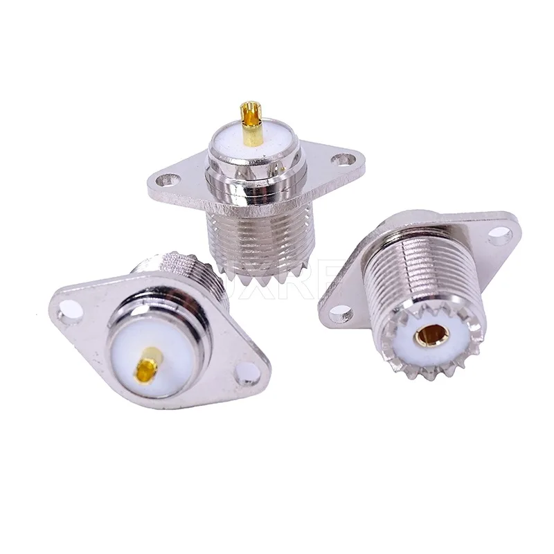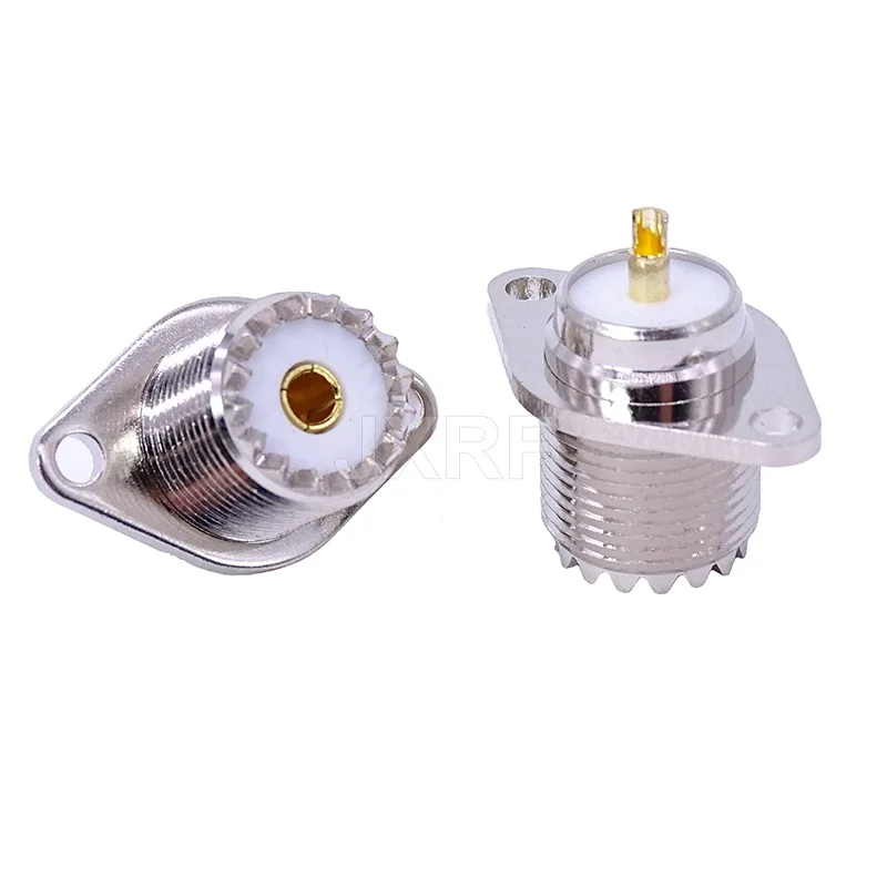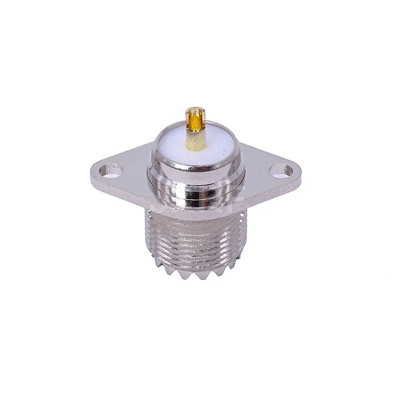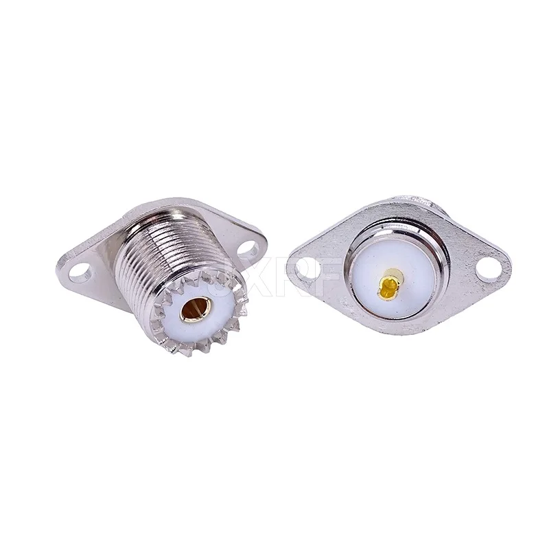 Experience reliable signal transmission with this UHF-KFD connector featuring a durable copper construction and a sleek, silver-colored finish. Designed with a 2-hole diamond flange for secure panel or chassis mounting, it supports UHF/SO239 interfaces for high-frequency applications. The connector includes a white insulator surrounding a gold-colored contact pin, complemented by a ridged, threaded cylindrical body for secure screw-in or bayonet attachment. Its precise engineering and corrosion-resistant materials ensure longevity and high performance in electronic and communication systems, making it an essential component for professionals seeking durable, dependable RF connections.