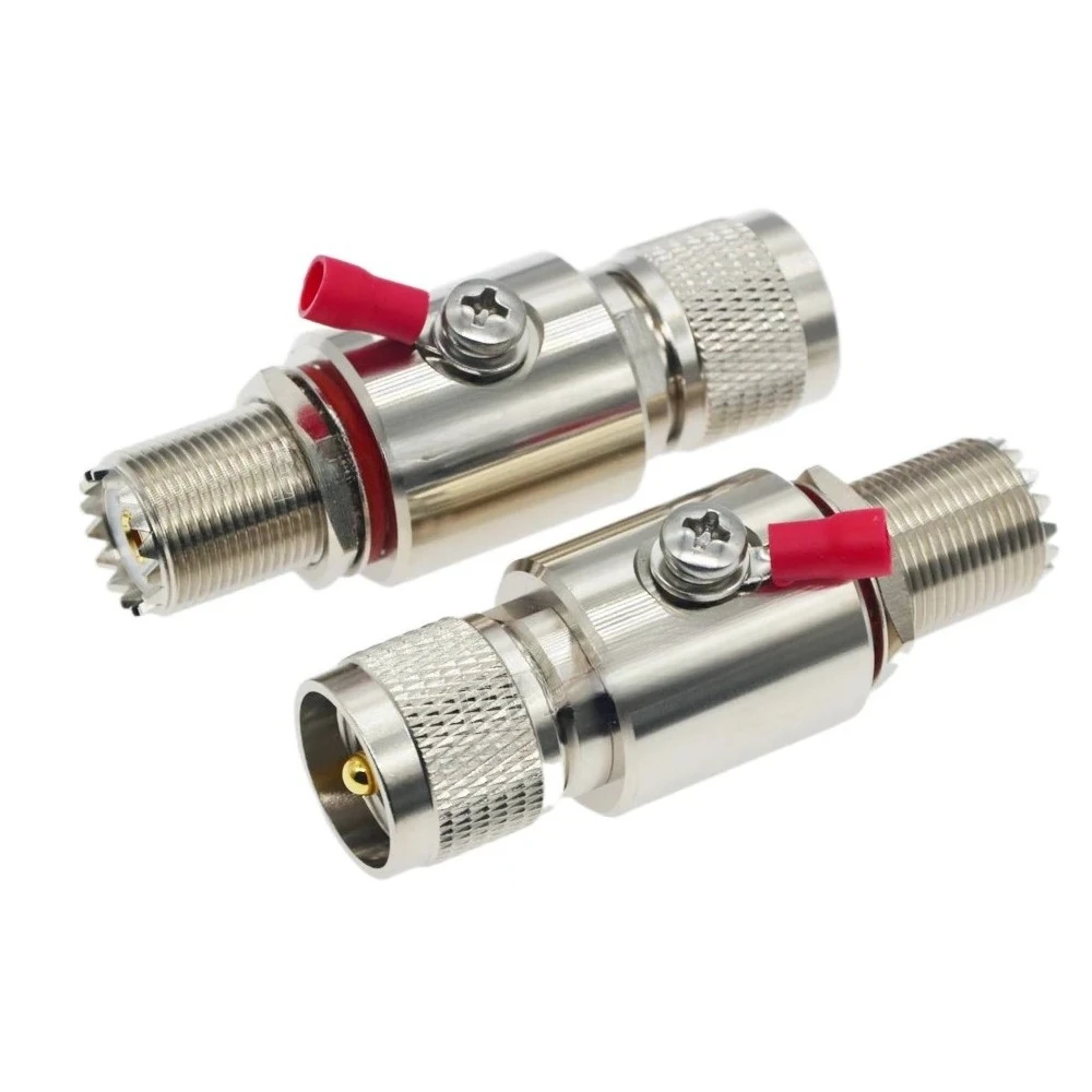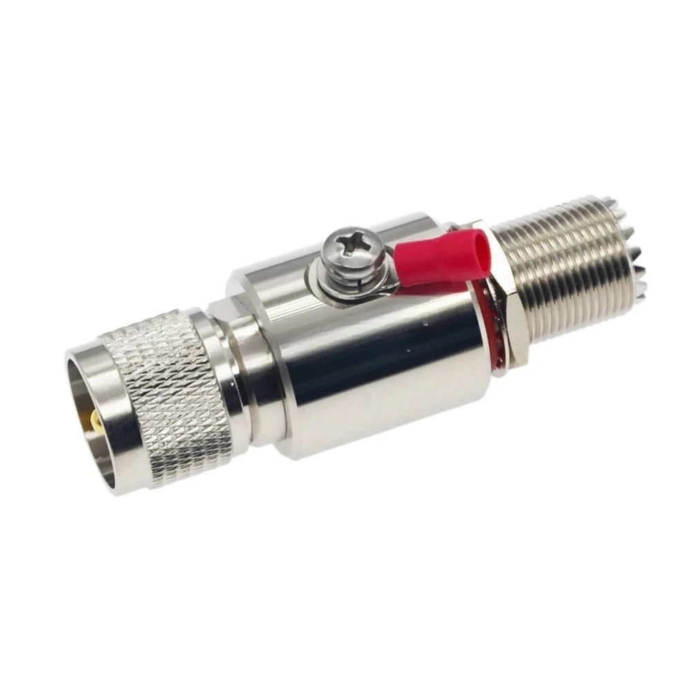 Experience reliable signal protection with this high-quality coaxial lightning arrester. Crafted from durable nickel-plated brass, it features a sleek cylindrical silver finish, combining modern aesthetics with robustness. The device seamlessly integrates UHF male (LN259) and UHF female (SO239) connectors, ensuring secure and stable connections. Its compact, polished design includes textured knurled grips for easy handling and a red gasket for weatherproof sealing. The removable screw cap allows quick replacement of internal gas discharge tubes (GDT), enhancing long-term performance. Designed for professional and amateur radio setups, this arrester effectively protects sensitive equipment from lightning strikes and electrical surges, maintaining optimal signal quality across a broad frequency range. Its aesthetic balance of function and form makes it an excellent addition to any signal system.