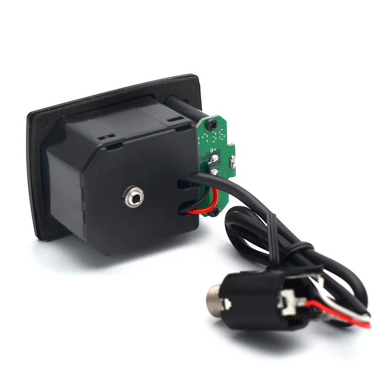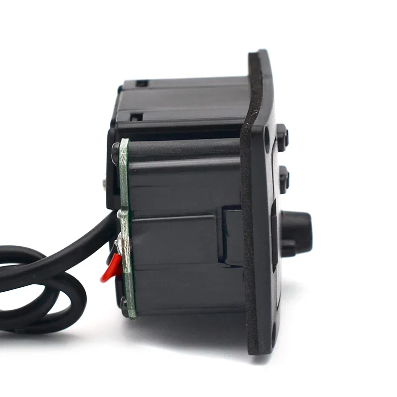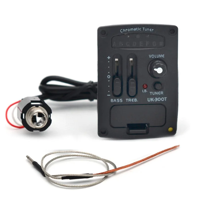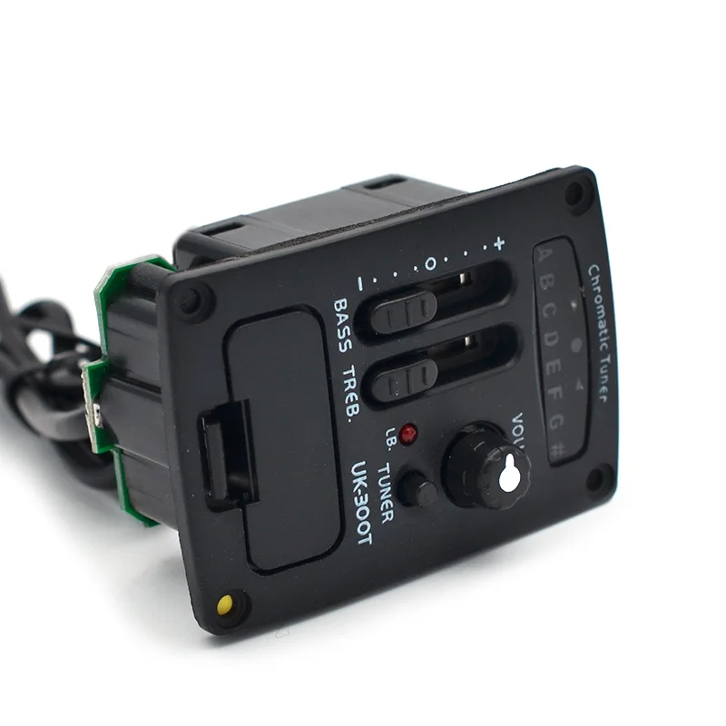 Experience precise tuning and sound shaping with this sleek, compact UK-300T chromatic tuner designed specifically for ukulele enthusiasts. Its minimalist black plastic casing blends modern aesthetics with functional engineering. The front includes a small, round black volume knob, a bright red LED indicator for easy visibility, and three horizontal sliders for fine adjustments of bass, treble, and level. Internal components are visible on one side, adding a touch of industrial appeal with green circuit boards and wiring. The device’s lightweight design (50g) and small dimensions (56 x 39 x 27mm) make it effortless to carry during performances or practice sessions. Whether you’re a professional or hobbyist, this tuner provides reliable, precise control for your musical needs.