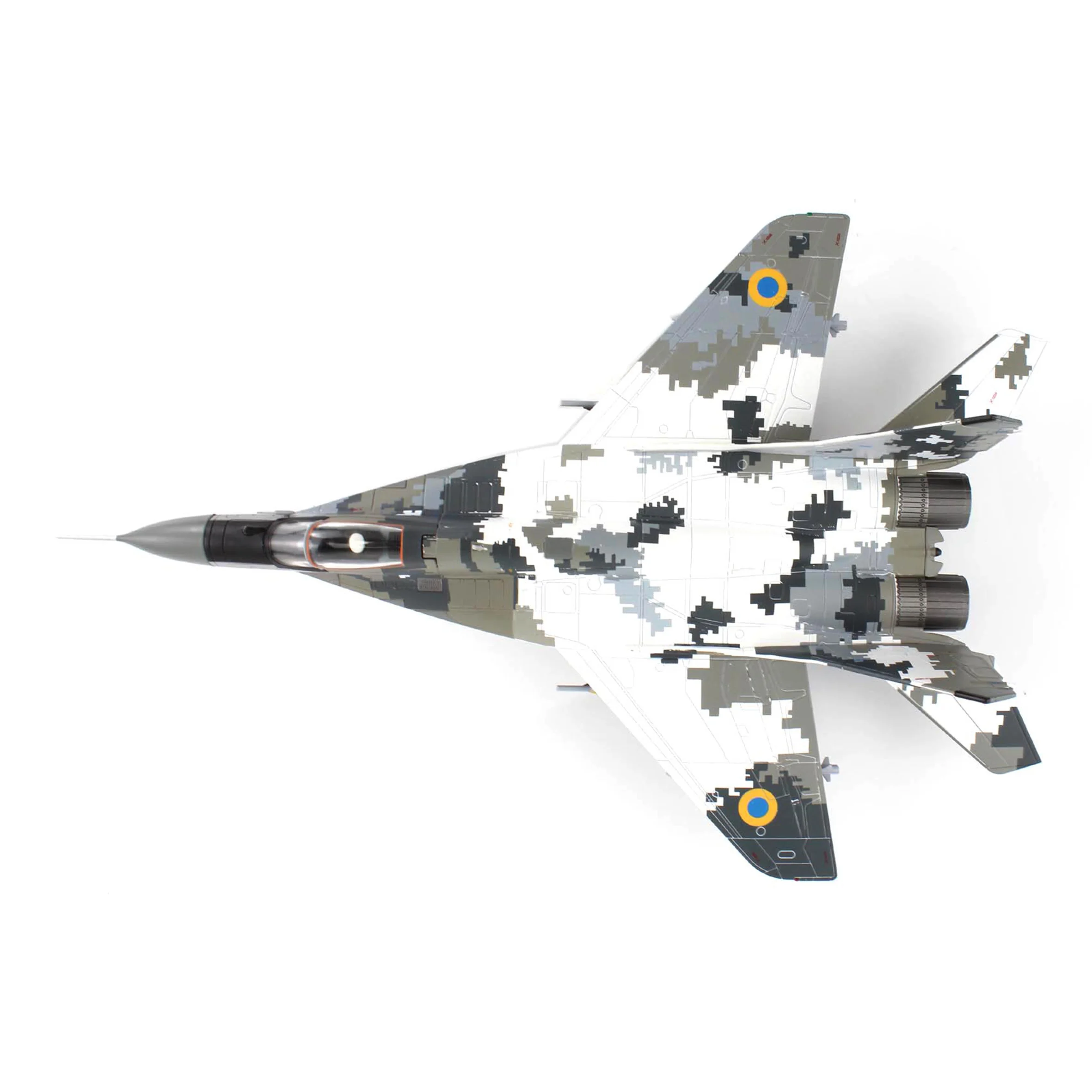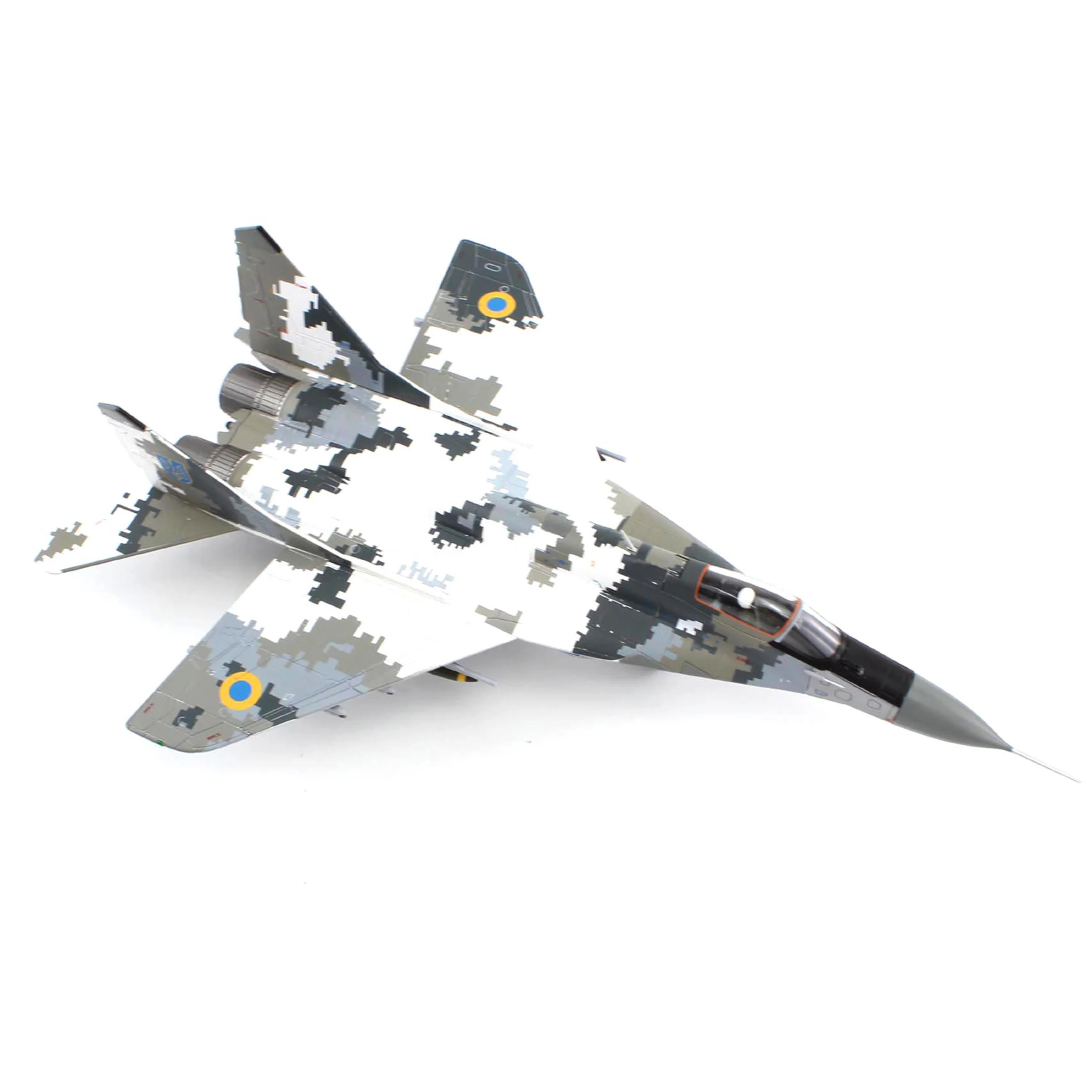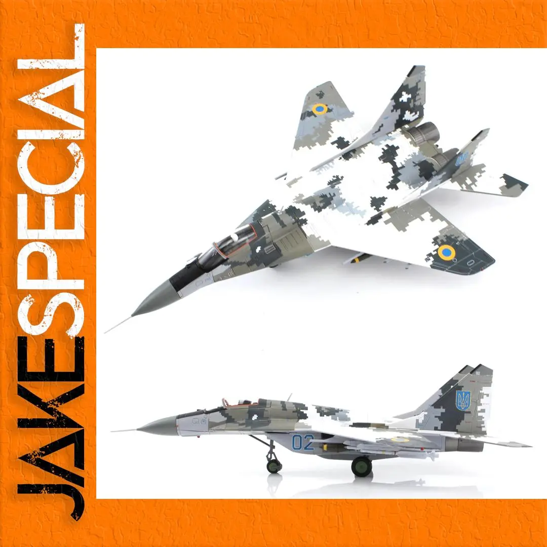 The 1/72 scale model of the Ukrainian MIG-29 9-13 “Fulcrum C” Bort 02 fighter showcases exceptional craftsmanship with a robust diecast metal body and detailed plastic accessories. Measuring approximately 24 cm in length and 13 cm in wingspan, this model features a striking camouflage pattern in gray, white, and blue, with a lighter gray underside. It proudly displays the bold blue number “02” along with Ukrainian national insignias. The model includes two JDAM-ER and two AGM-88 missiles, while its accurately detailed design highlights features such as panel lines, rivets, and exhaust nozzles, embodying the essence of military aviation.