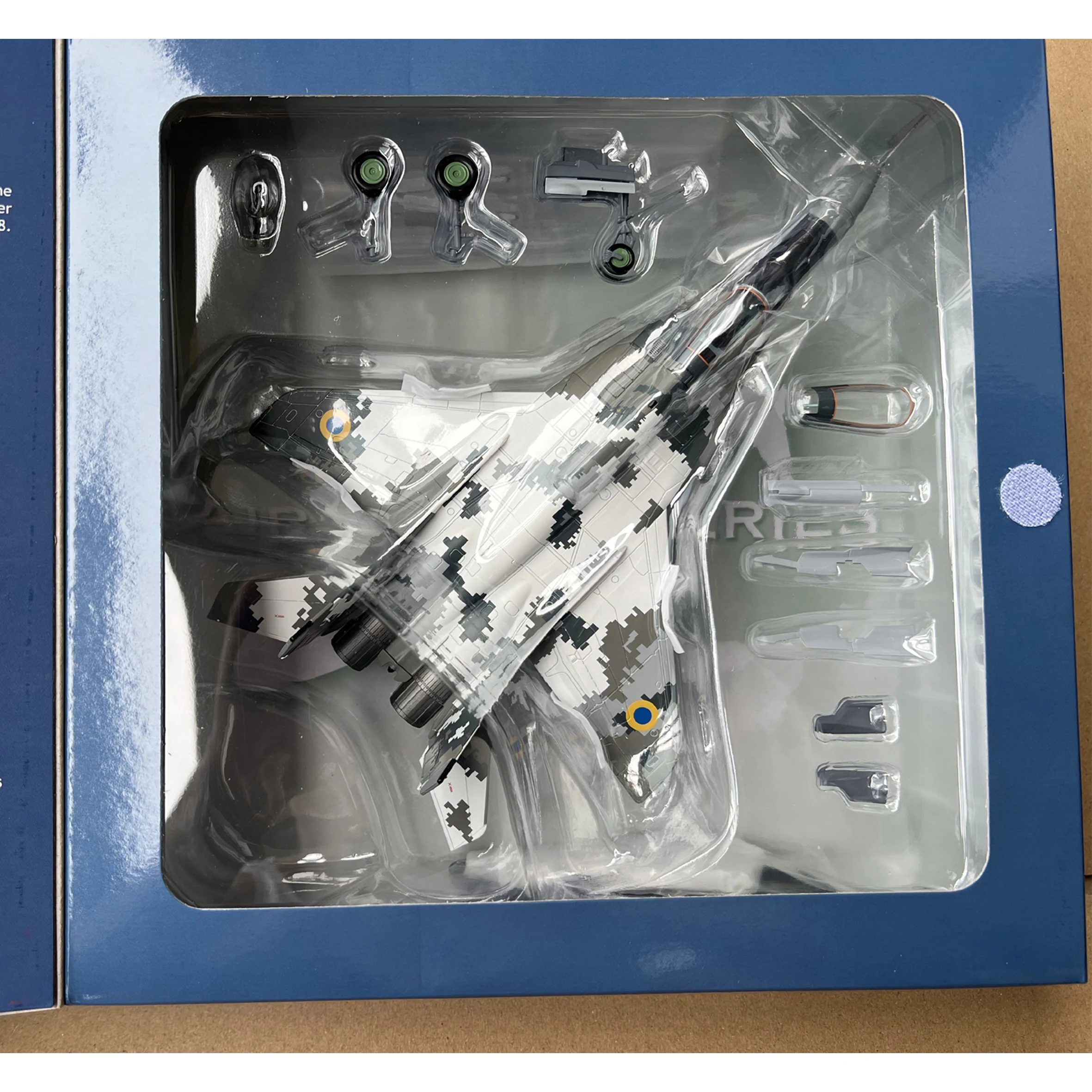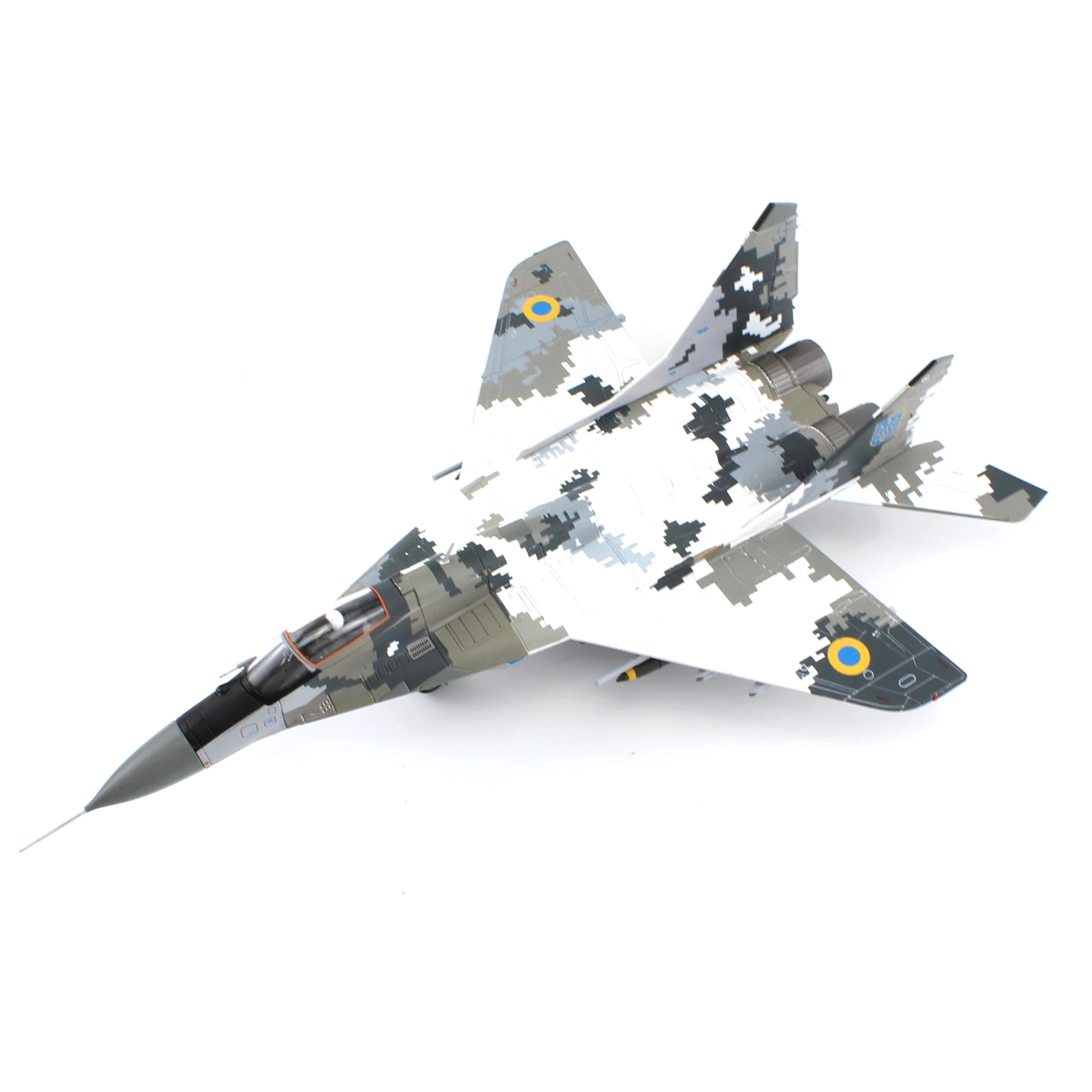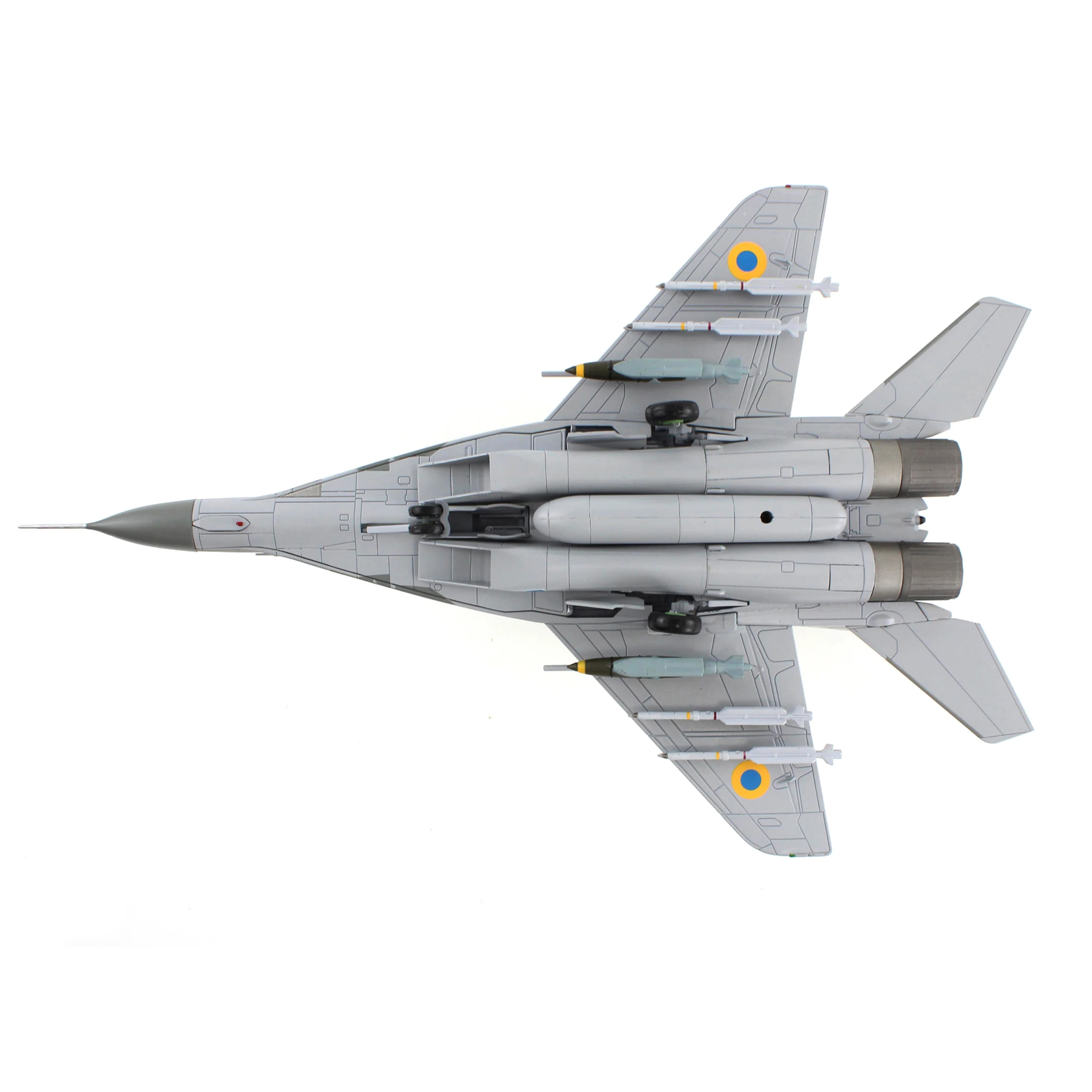 The 1/72 scale model of the Ukrainian MIG-29 9-13 “Fulcrum C” Bort 02 fighter showcases exceptional craftsmanship with a robust diecast metal body and detailed plastic accessories. Measuring approximately 24 cm in length and 13 cm in wingspan, this model features a striking camouflage pattern in gray, white, and blue, with a lighter gray underside. It proudly displays the bold blue number “02” along with Ukrainian national insignias. The model includes two JDAM-ER and two AGM-88 missiles, while its accurately detailed design highlights features such as panel lines, rivets, and exhaust nozzles, embodying the essence of military aviation.