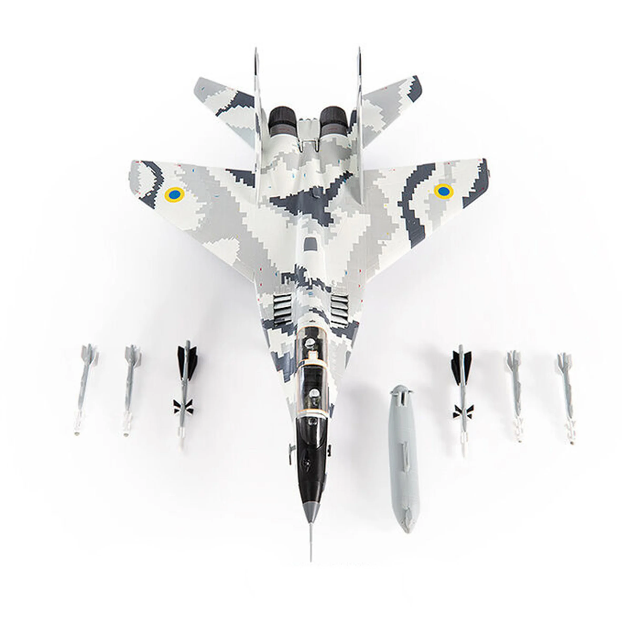 This exquisite diecast model of the Ukrainian MiG-29UB fighter aircraft captures the captivating essence of military aviation. Crafted at a scale of 1:72, it elegantly measures approximately 24 cm in length and boasts a wingspan of about 13 cm. Its robust metal construction ensures durability, while the striking camouflage in shades of gray with white and black accents adds to its realism. Every fine detail, from air intake grilles to the sleek black nose, is meticulously represented. The clear canopy reveals the intricate cockpit, making it an ideal piece for collectors who appreciate high-quality aviation models.