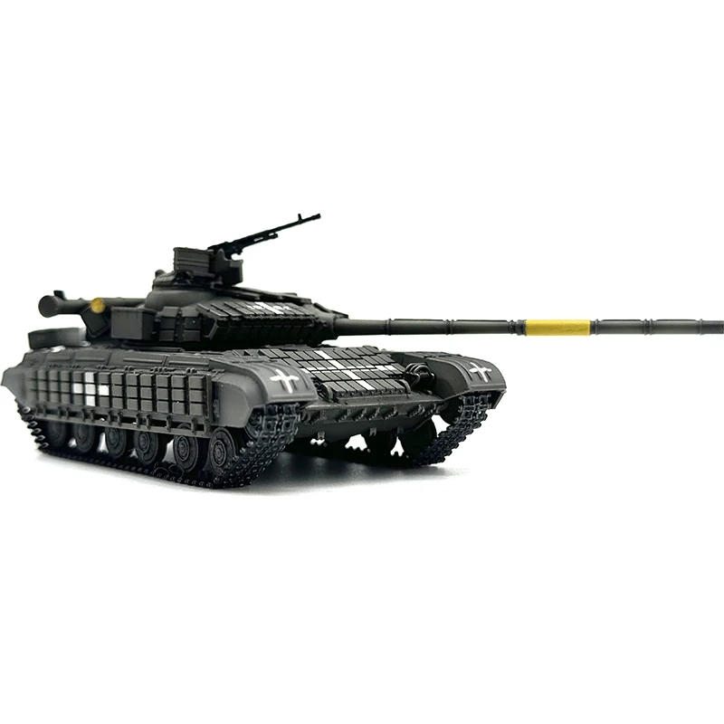 Discover the detailed 1:72 scale plastic model of the Ukrainian T-64BV main battle tank, crafted from PVC plastic in a realistic dark, muted gray hue (“01”). This meticulously engineered model features a textured surface with finely molded panels, rivets, and mechanical details, capturing an authentic military appearance. The turret, centrally positioned, includes an open hatch and a mounted machine gun, while the long, segmented main gun barrel extends from the turret with a contrasting yellow band near the base. Designed for display and collection, it measures proportionally to the 1:72 scale and is suitable for enthusiasts aged 14 and above, emphasizing precision, realism, and intricate craftsmanship.