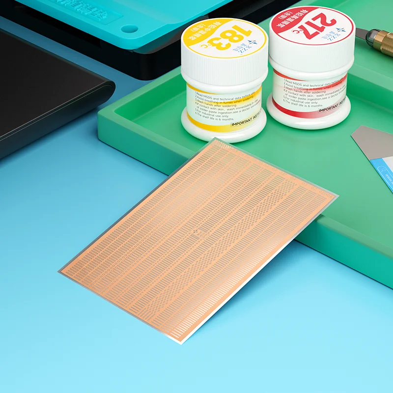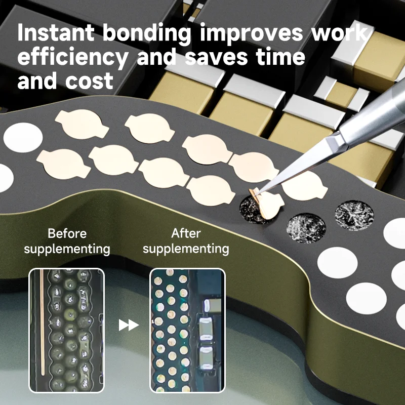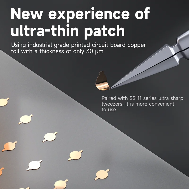This ultra-thin repair welding patch set features a durable plastic sheet with a metallic copper-colored finish, designed for precise spot soldering on phone motherboards. Organized in a dense grid pattern, each patch has fine grooves for optimal electrical contact, making it ideal for repairing ICs, CPUs, WiFi modules, hard drives, and drop points. The flexible, sleek design ensures easy application and reliable performance, with no harmful chemicals involved. This single-piece set provides a high-quality, meticulous solution for advanced electronic repairs, helping you achieve professional-grade results with confidence.