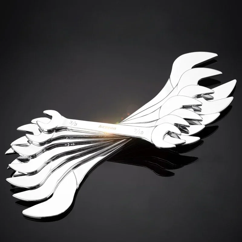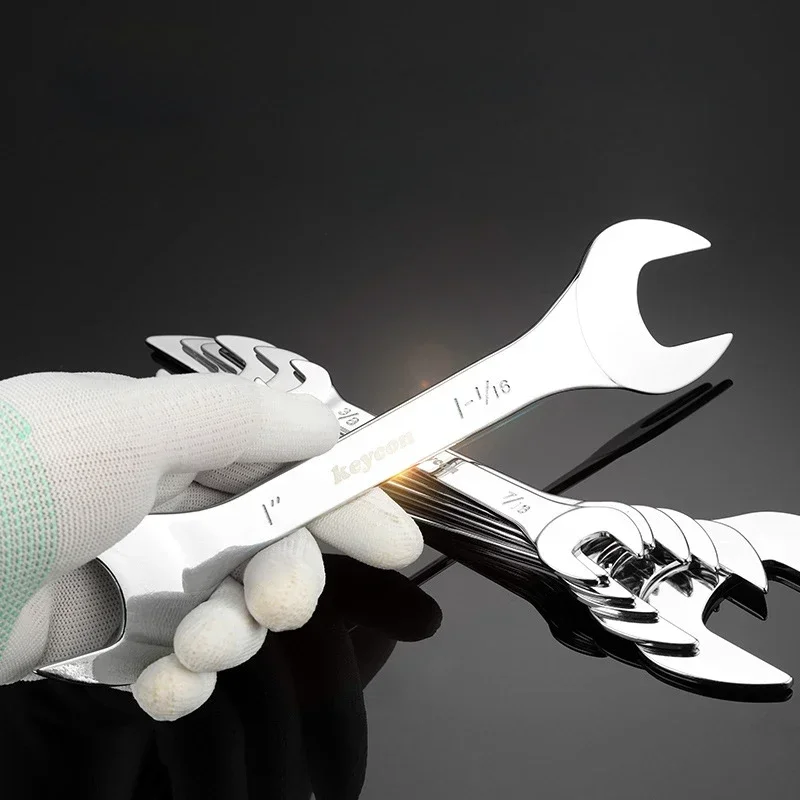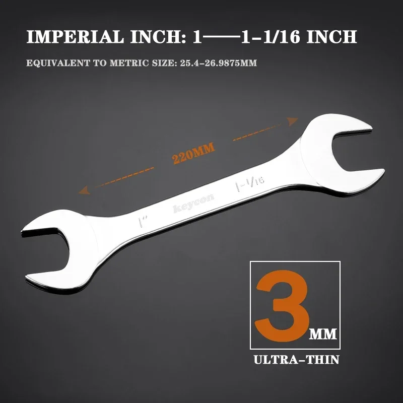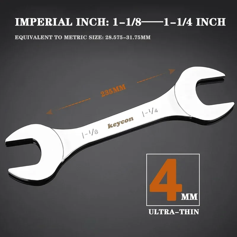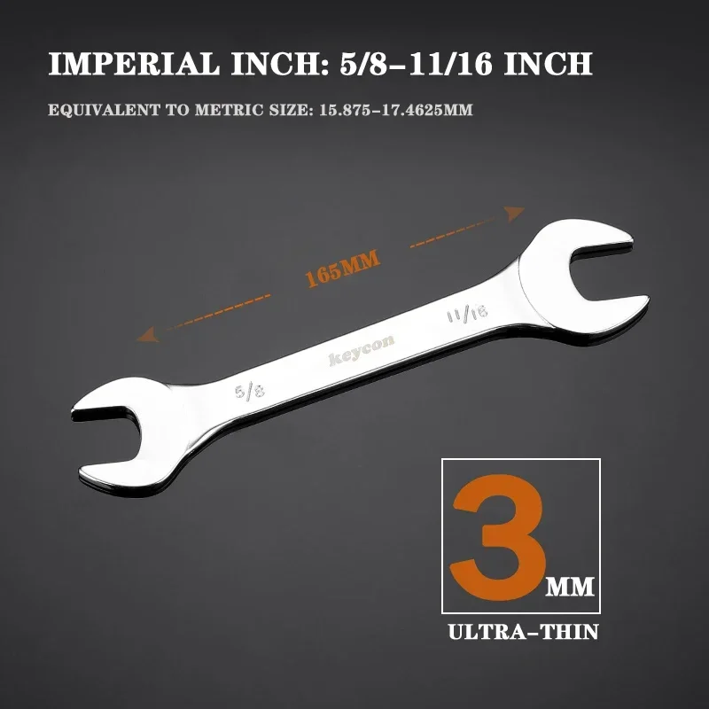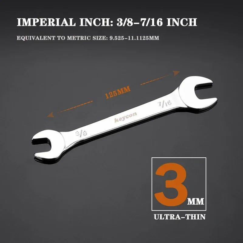 Experience precision and durability with this ultra-thin open-end wrench, crafted from high-carbon steel. Measuring just 3mm or 4mm thick, each tool offers a lightweight yet sturdy profile, ideal for confined spaces and detailed mechanical work. The design features a polished silver finish, highlighting the fine craftsmanship and minimalist style. With sizes ranging from 3/8 inch to 1-1/4 inch, including 3/8×7/16, 1/2×9/16, 5/8×11/16, 3/4×13/16, 7/8×15/16, 1×1-1/16, and 1-1/8×1-1/4″, they provide versatile functionality. Each wrench is double-ended and multifunctional, making them perfect for drive shafts and intricate mechanical tasks. Elevate your toolkit with this high-quality, compact tool designed for professionals and enthusiasts alike.