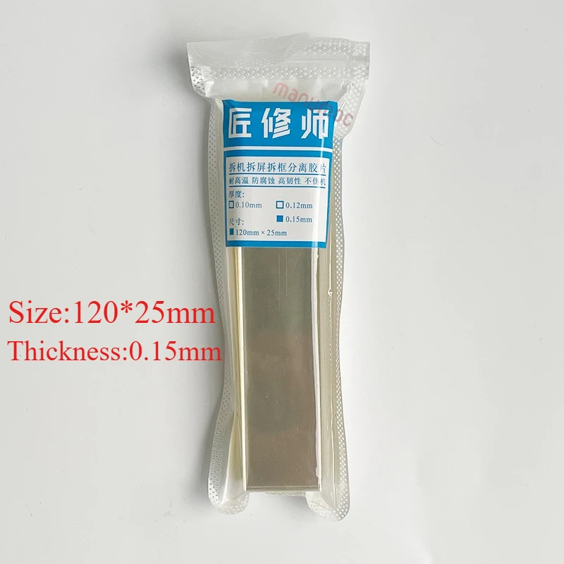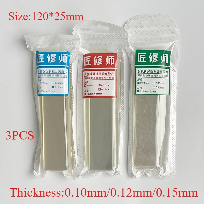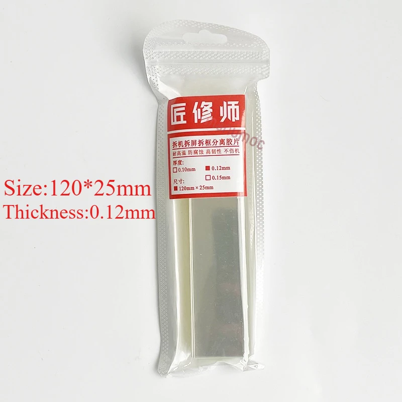 This set of 100 ultra-thin plastic LCD phone disassembly films, available in 0.12mm and 0.15mm thicknesses, is ideal for precisely opening and separating curved screen frames during repairs. Made from durable plastic, these flexible, glossy sheets ensure safe, damage-free detachment for repair professionals and DIY enthusiasts alike. The sleek, minimalist design highlights their lightweight and high-quality material, making delicate screen separation effortless. Perfect for seamless frame removal and screen detachment, these films provide reliable performance in high-temperature conditions up to 120°C, coupled with resistance to corrosion and tough durability.