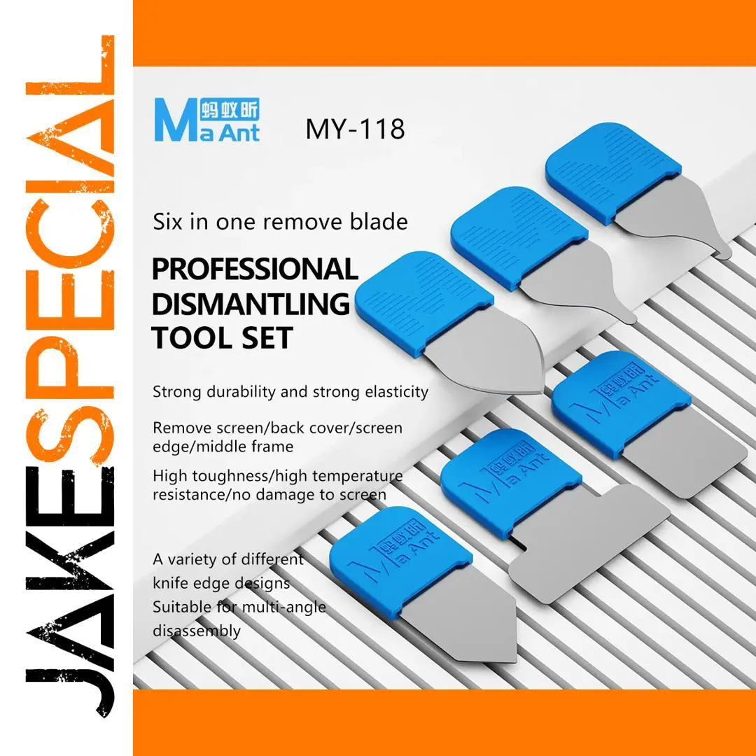 Discover the MaAnt MY-118 tool set, a collection of 6 ultra-thin metal steel opening tools designed specifically for mobile phone battery removal and LCD screen disassembly. Crafted from an aluminum-copper alloy, these tools offer strength and durability while ensuring precision handling. Whether you're a DIY enthusiast or a professional technician, these tools provide the perfect balance of flexibility and sturdiness, enhancing your repair experience. Picture yourself effortlessly opening devices, securely removing batteries, or safely prying screens with confidence. Transform your repair journey with this reliable tool set, helping you to achieve successful results every time.