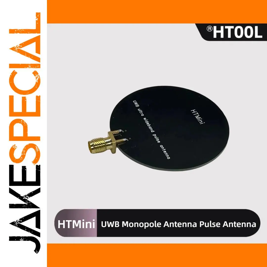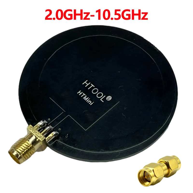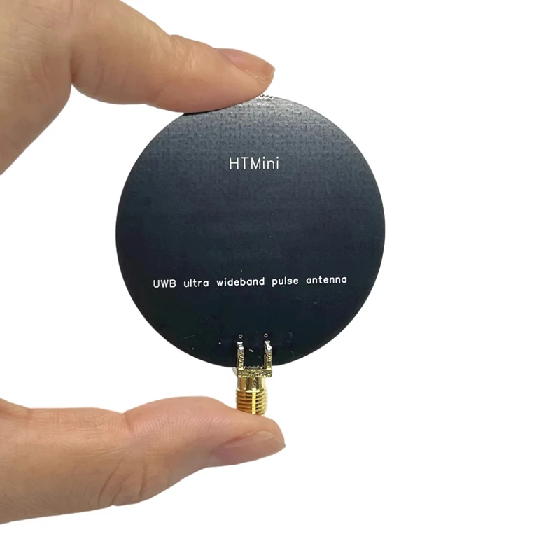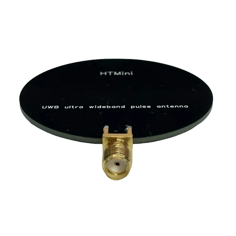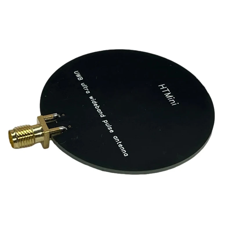 Experience cutting-edge precision with this sleek and compact HTMini Ultra Wideband Pulse Antenna. Designed for high-performance applications, its round, flat silhouette combines a minimalistic matte black finish with an elegant gold SMA connector, offering both style and functionality. Its professional look makes it suitable for laboratory, research, or wireless communication environments. Whether you're analyzing spectrum, monitoring signals, or conducting electromagnetic research, this antenna provides exceptional stability and accuracy. Its small size ensures ease of integration into space-constrained setups, while its high efficiency guarantees optimal signal transmission across a broad frequency range of 2.4 GHz to 10.5 GHz. Trust in this device to elevate your technical projects with reliability and sophistication.