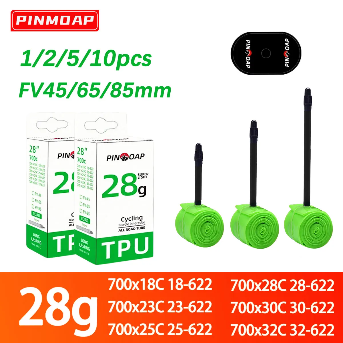 - Technical specifications: weight 28g (+3g), compatible with 700C tires (18-32C), valve options include 45mm, 65mm, 85mm, high elasticity TPU, maximum pressure 5 bar, inflation pressure 0.5 bar, with easy installation for road biking enthusiasts.