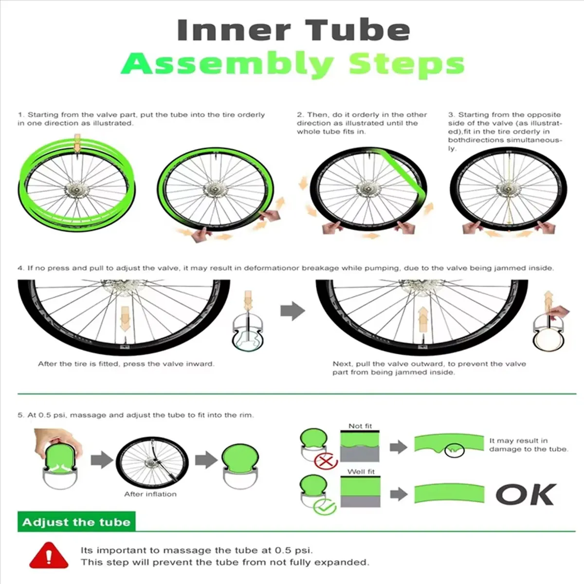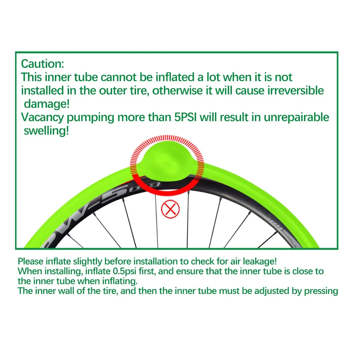 - Designed to withstand pressures up to 0.5 bar (8 psi) for optimal safety and performance, with a maximum inflation capacity of 5 bar (72 psi) on rims without ring fastening systems.