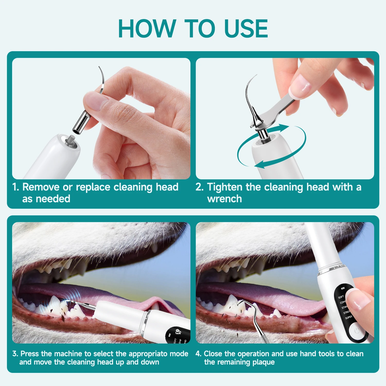 - Built-in LED light enhances visibility in the pet’s mouth, assisting in accurate tartar removal and ensuring safe, effective dental procedures during cleaning sessions.