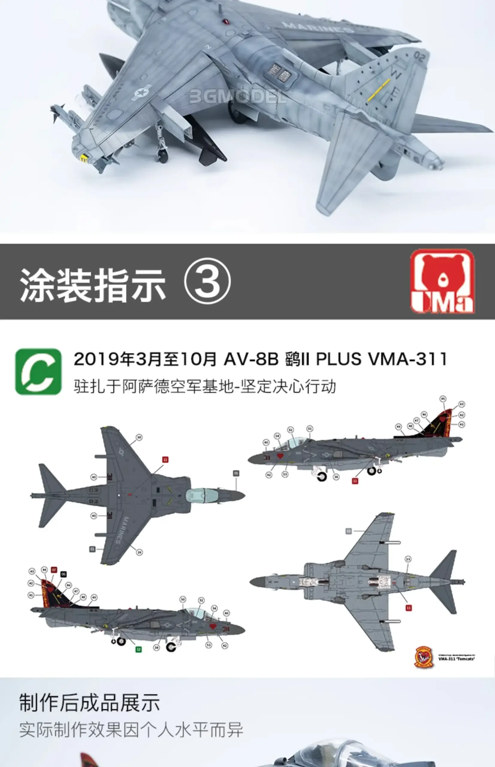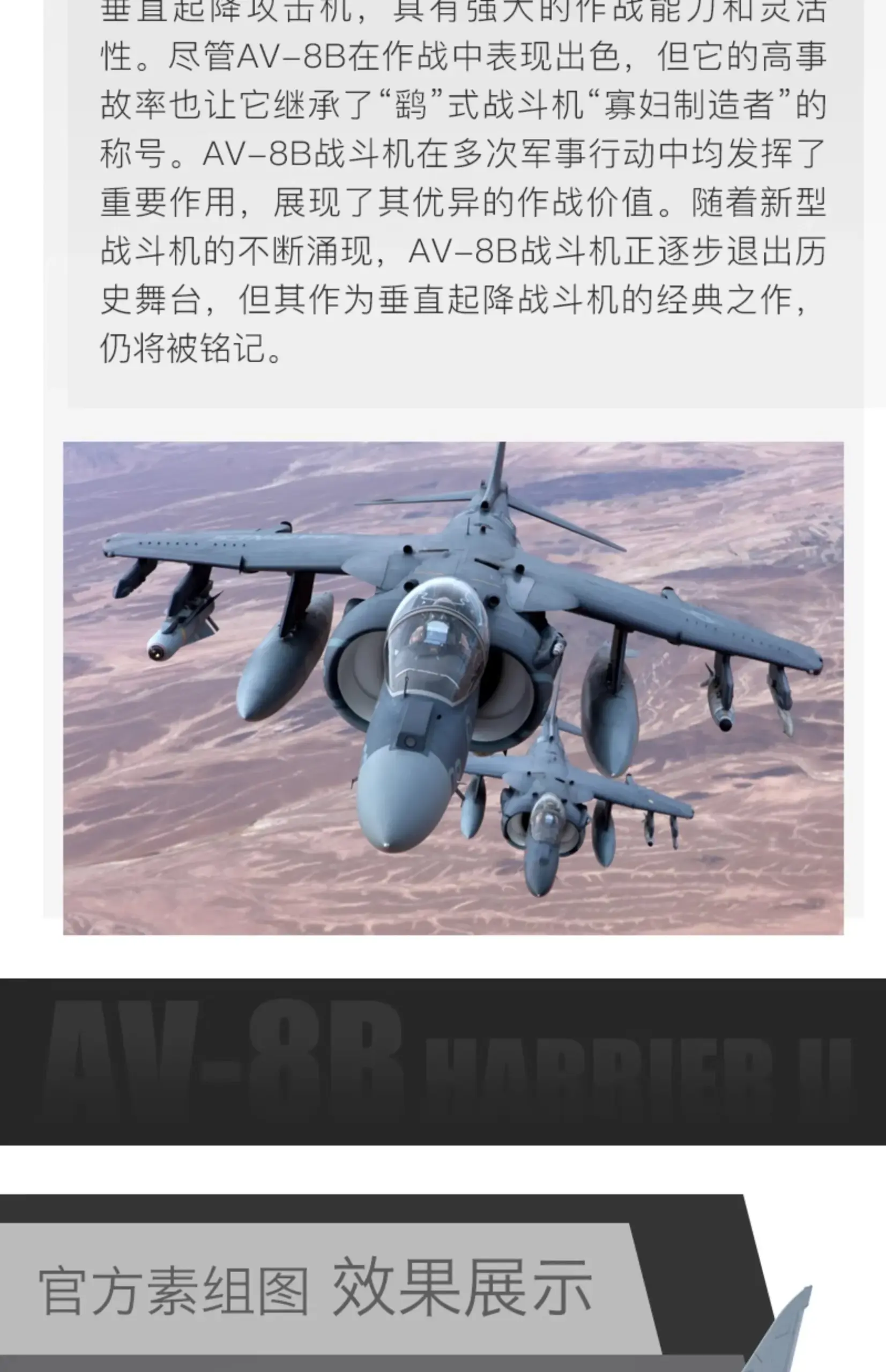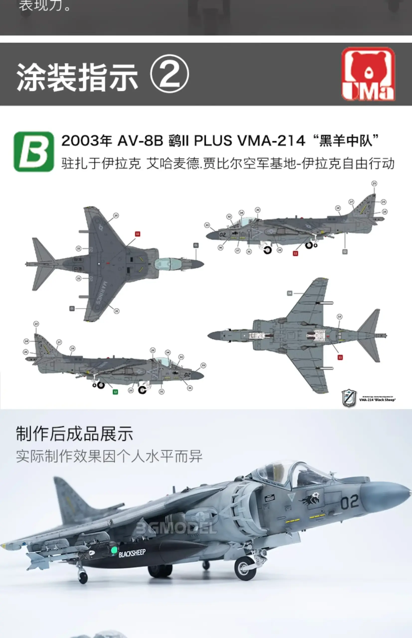- Scale: 1:48, providing an impressive representation of the AV-8B Harrier II PLUS.