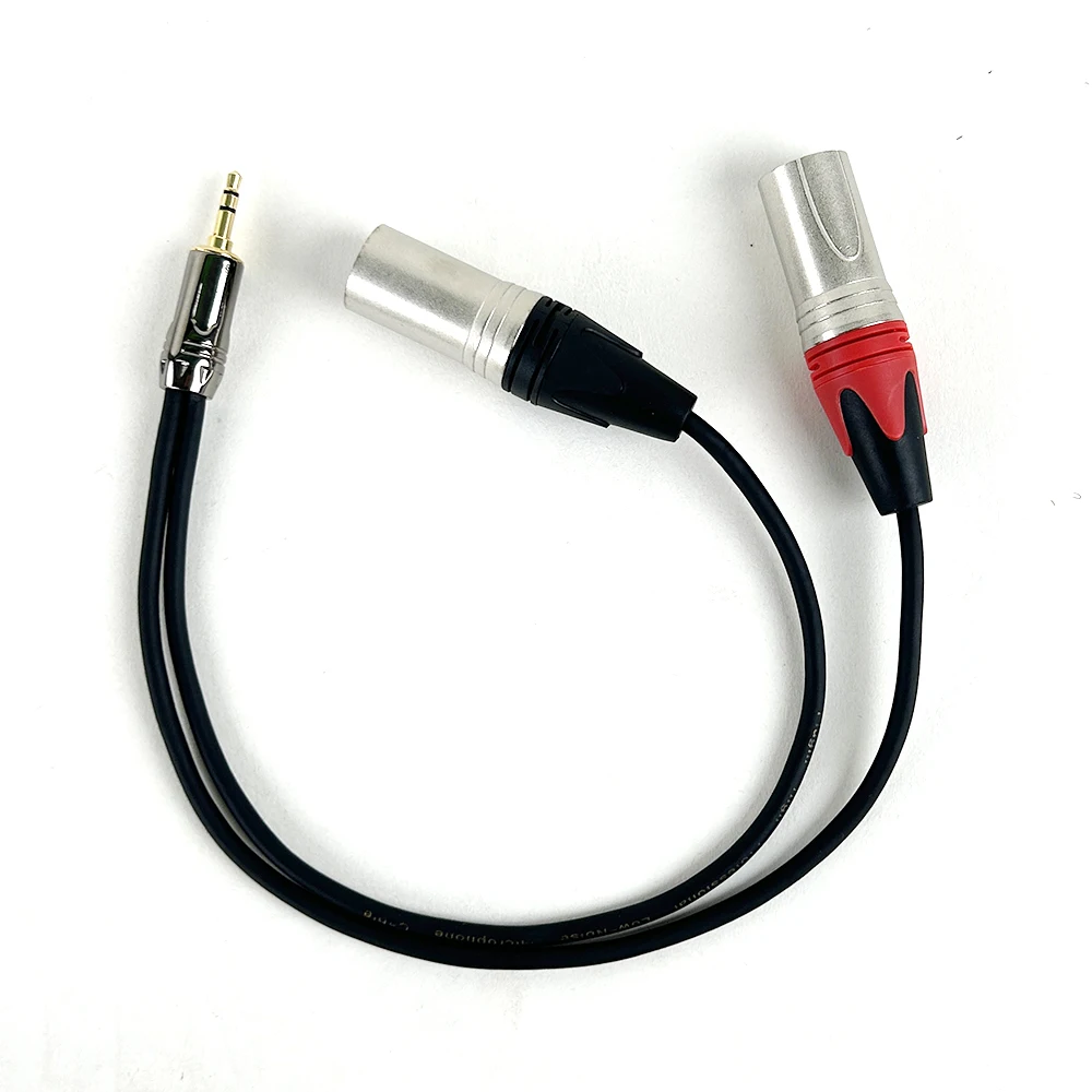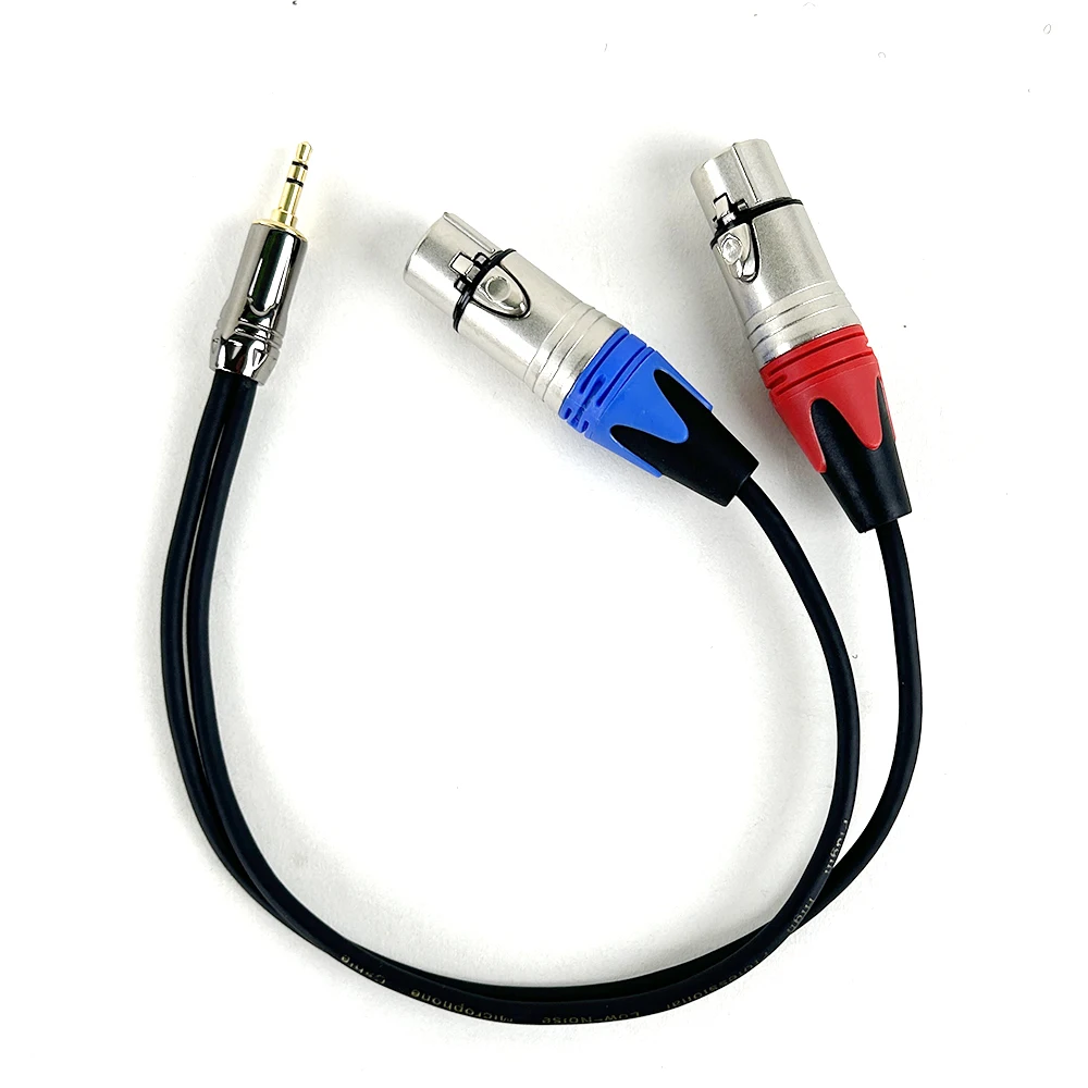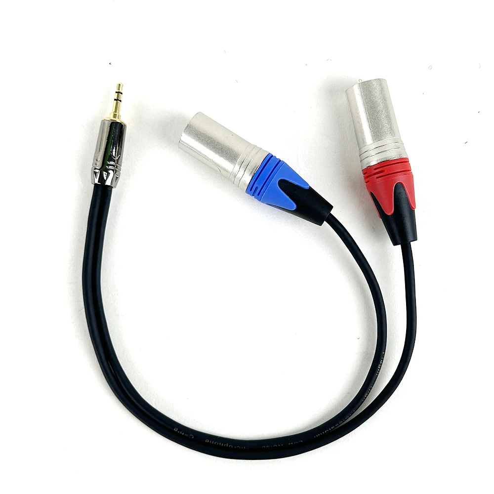 This professional-grade audio extension cable features a 3.5mm TRS male connector housed in a matte black plastic casing with a gold-plated tip, and dual XLR (3-pin) connectors available in male or female versions, with vibrant color-coded rubber strain reliefs in red and black or blue and black. The 4mm diameter cable, available in lengths from 0.3m to 5m, is made from oxygen-free copper conductors with braid shielding, ensuring minimal noise and high-quality sound transmission. Its flexible PVC jacket and durable metal housings make it ideal for connecting smartphones, tablets, laptops, or computers to mixing consoles, studio monitors, or PA systems, providing reliable unbalanced stereo to dual XLR signal splitting.