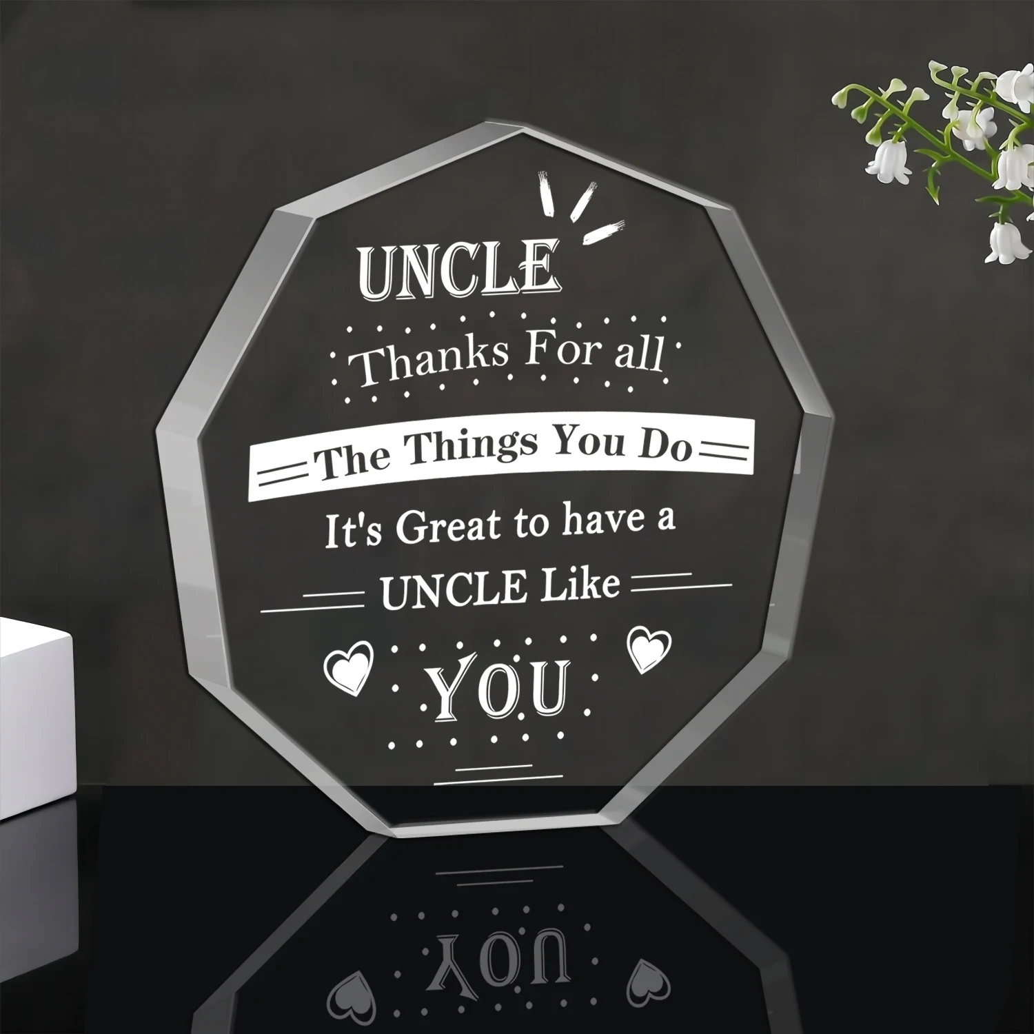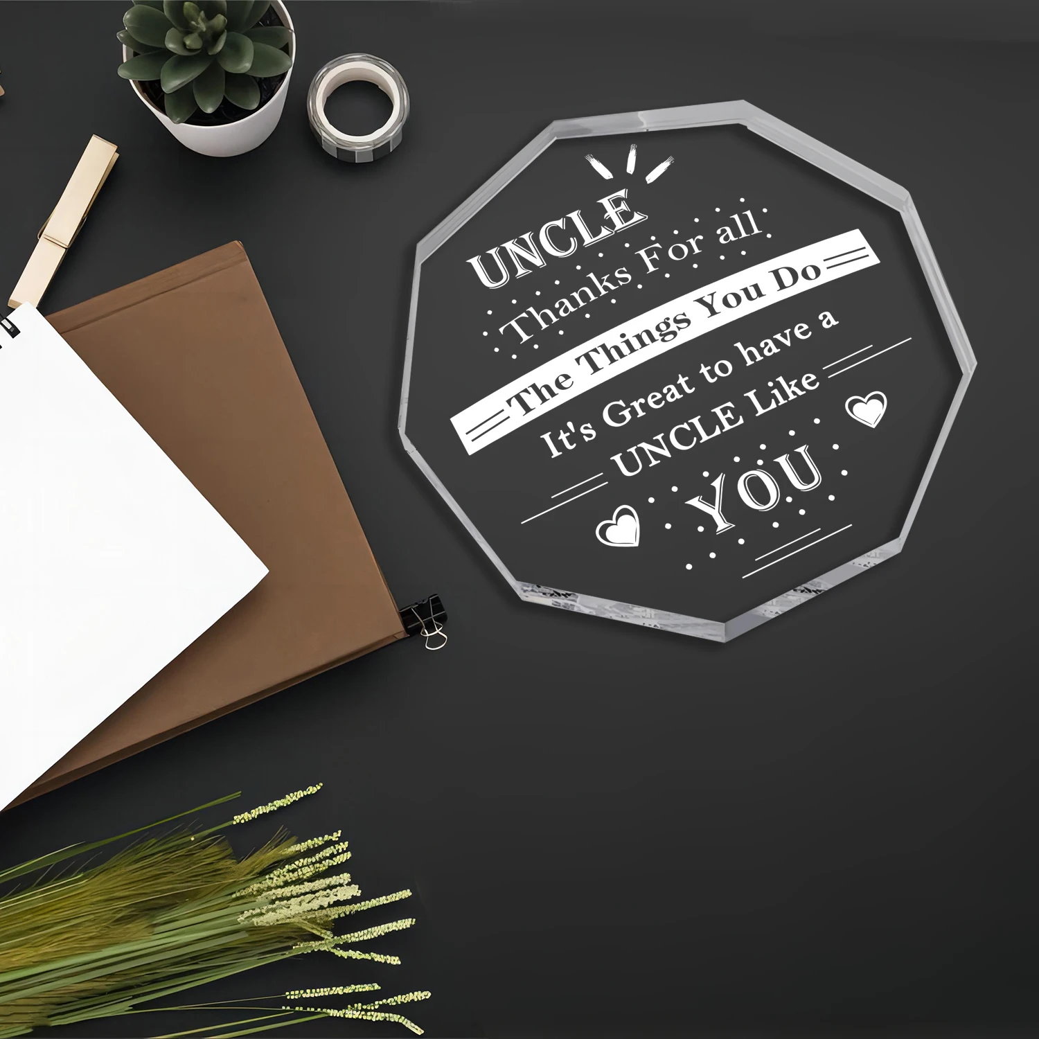 Imagine presenting this heartfelt keepsake to your favorite uncle, a symbol of gratitude and love. Crafted from durable plastic, this octagonal-shaped souvenir features a clear, polished surface that shines with elegance. Its crisp white inscription, reading “UNCLE Thanks For all The Things You Do It's Great to have a UNCLE Like YOU,” is beautifully etched with tiny hearts, dotted lines, and decorative accents that add a playful touch. Perfect for birthdays or Christmas, this gift is designed to evoke warmth and affection. Its model/color code DM-1668 gives it a unique identity, making it a meaningful token that your uncle will cherish. Bring a personal touch to your gift-giving today with this stylish, sentimental piece.