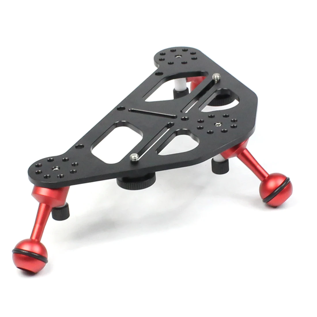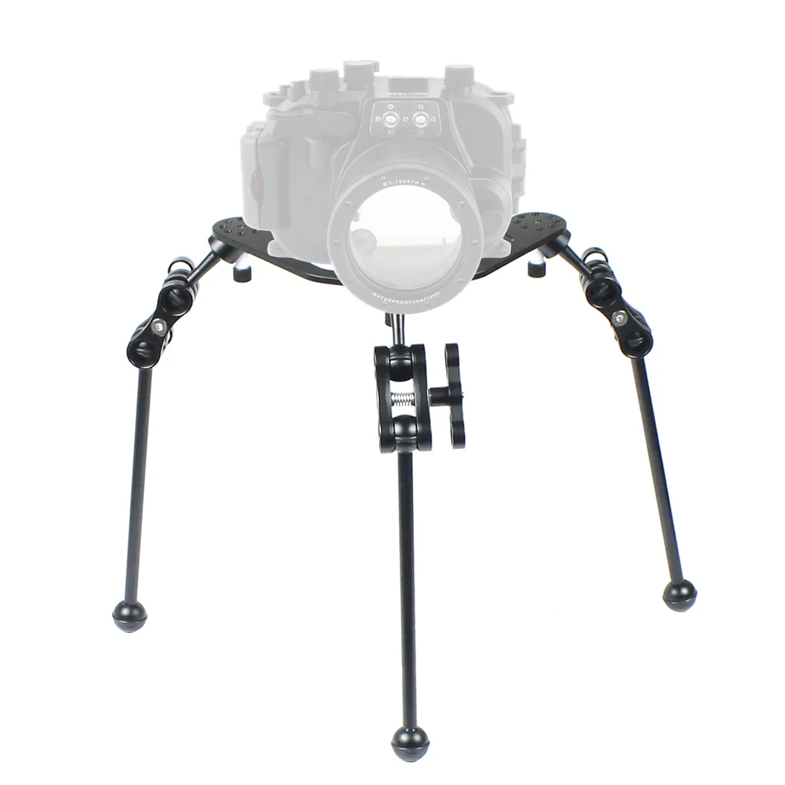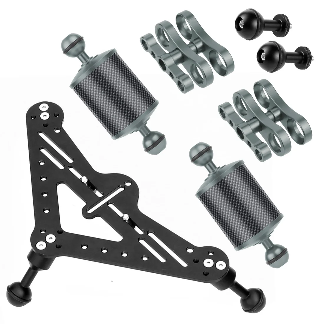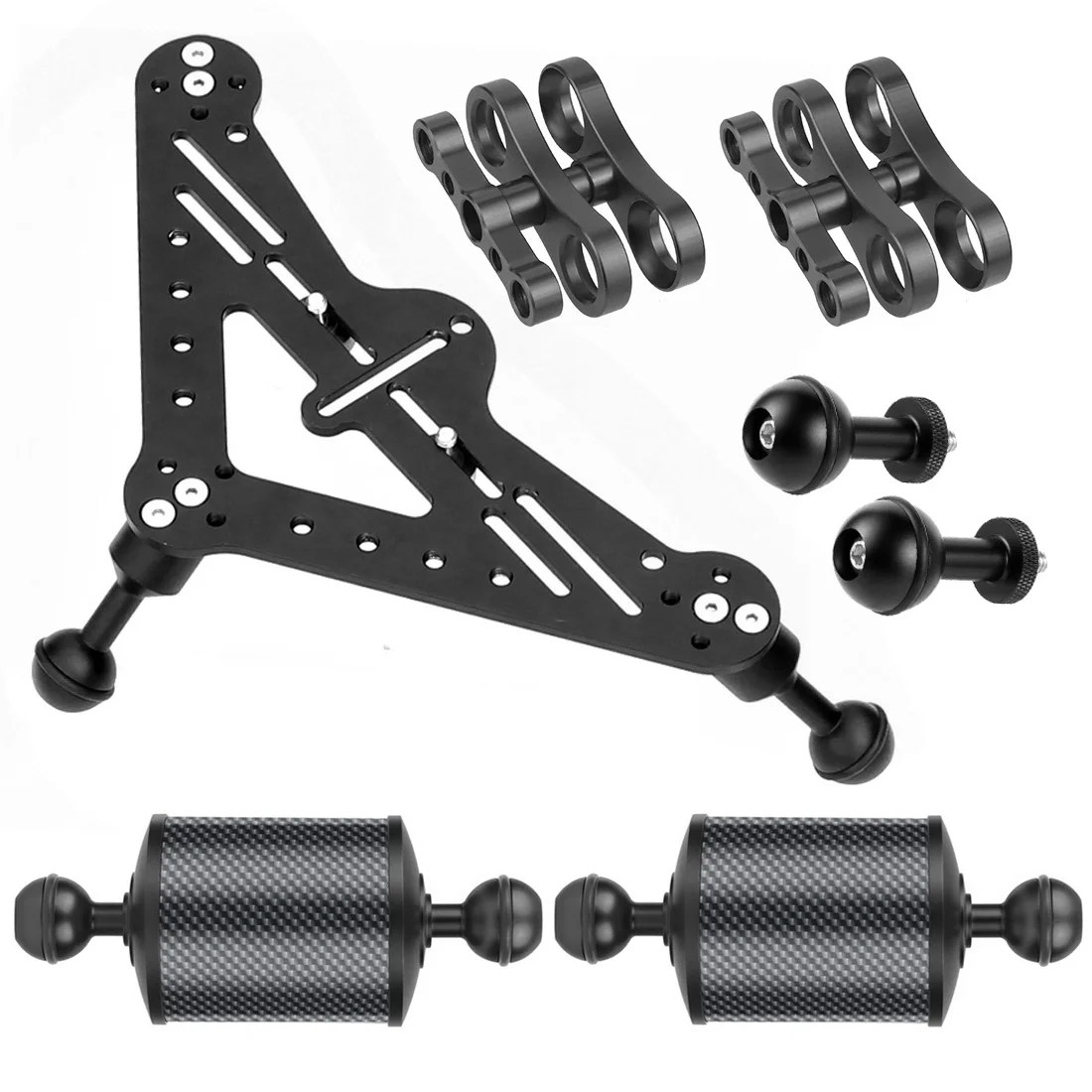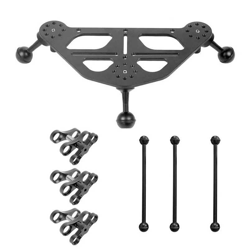 Enhance your underwater photography with this durable, lightweight aluminum alloy tripod rig featuring a 240mm x 103mm x 5mm triangular gimbal design that provides exceptional stability and balance. Weighing only 176 grams (excluding accessories), it supports seamless switching between camera and light stand stabilizer brackets, making it ideal for both beginners and professionals. The system includes a sturdy gimbal, three T-adapters, and a combo set with upgraded components such as a carbon fiber float buoyancy arm and dual ball aquatic arm with a 1″ floating ball and butterfly clip. Its sleek black finish and modular design ensure reliable performance and ease of use in underwater environments.