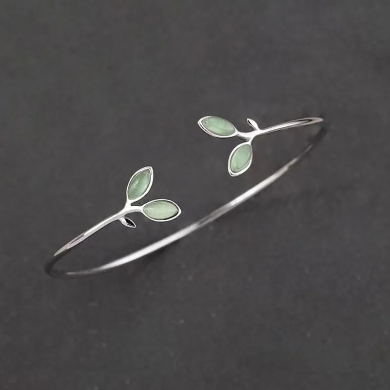 Imagine adding a touch of nature-inspired elegance to your everyday style with this handcrafted bracelet. Its slim, curved copper band features a mesmerizing multi-color hologram finish that subtly shifts with movement, creating a captivating shimmering effect. The minimalist plant motif, composed of two delicate stems with sleek, elongated green leaves, offers a modern yet vintage look. The centerpiece is a glossy, semi-translucent green cat's eye stone, securely set in a minimalist bezel, drawing attention with its gentle glow. Designed for comfort and versatility, this unisex accessory effortlessly complements various outfits and occasions, making it a perfect gift for someone special or a treat for yourself. Wrap your wrist in style and natural beauty today.