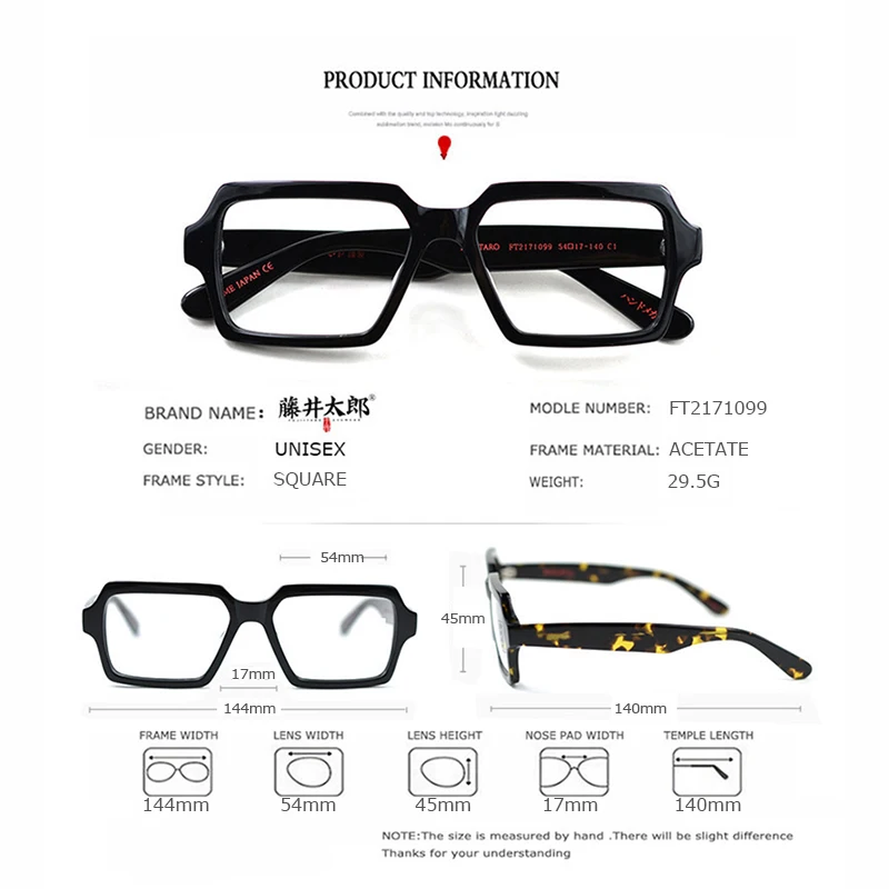 - Technical specs include model number FT2171099, plastic frame material, CE certification, color options, and compatibility with various lenses. The frame measures precisely for an optimal fit.