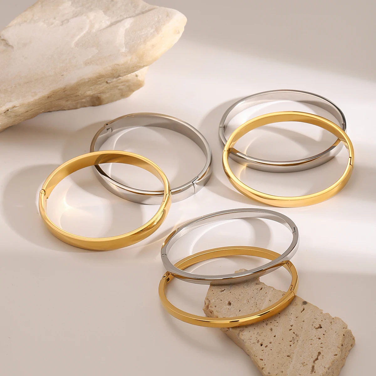 - Finished with a polished, mirror-like surface, these bangles reflect light beautifully, highlighting their high-quality stainless steel construction in attractive gold-tone or silver-tone options.