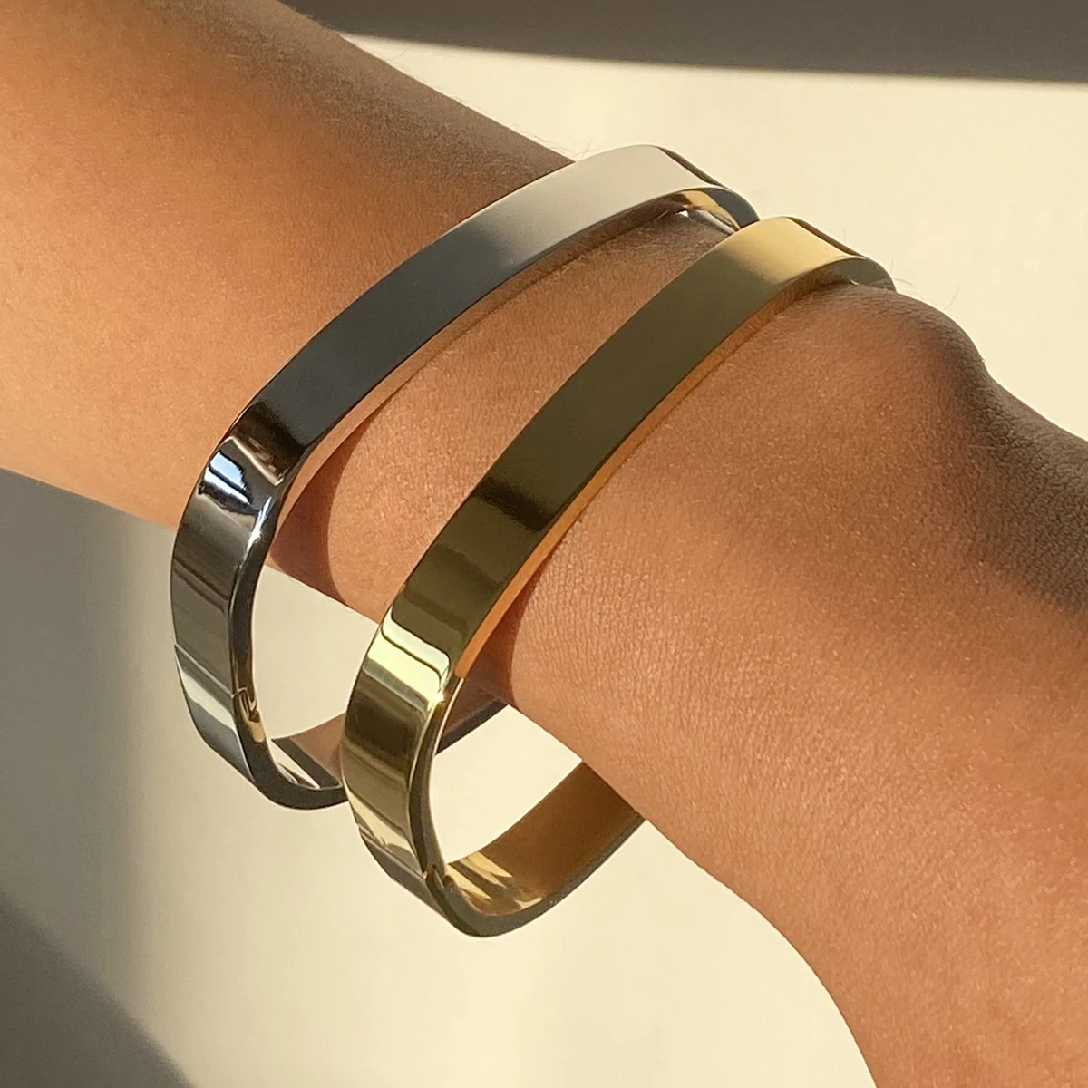 Imagine effortlessly enhancing your personal style with this modern, unisex stainless steel bangle. Crafted from high-quality, durable stainless steel, it offers a sleek, minimalist design that fits seamlessly into any wardrobe. Available in shiny gold and polished silver finishes, these bangles feature a smooth, rounded rectangular shape with slightly curved edges, ensuring comfort and elegance. The adjustable hinge or clasp mechanism guarantees a secure, easy fit, while their mirror-like reflective surface emphasizes the high-end craftsmanship. Designed to be resistant to tarnish, these jewelry pieces are also suitable for sensitive skin, providing a hypoallergenic experience without sacrificing style. Perfect for both everyday wear and special occasions, they are versatile additions to your collection.