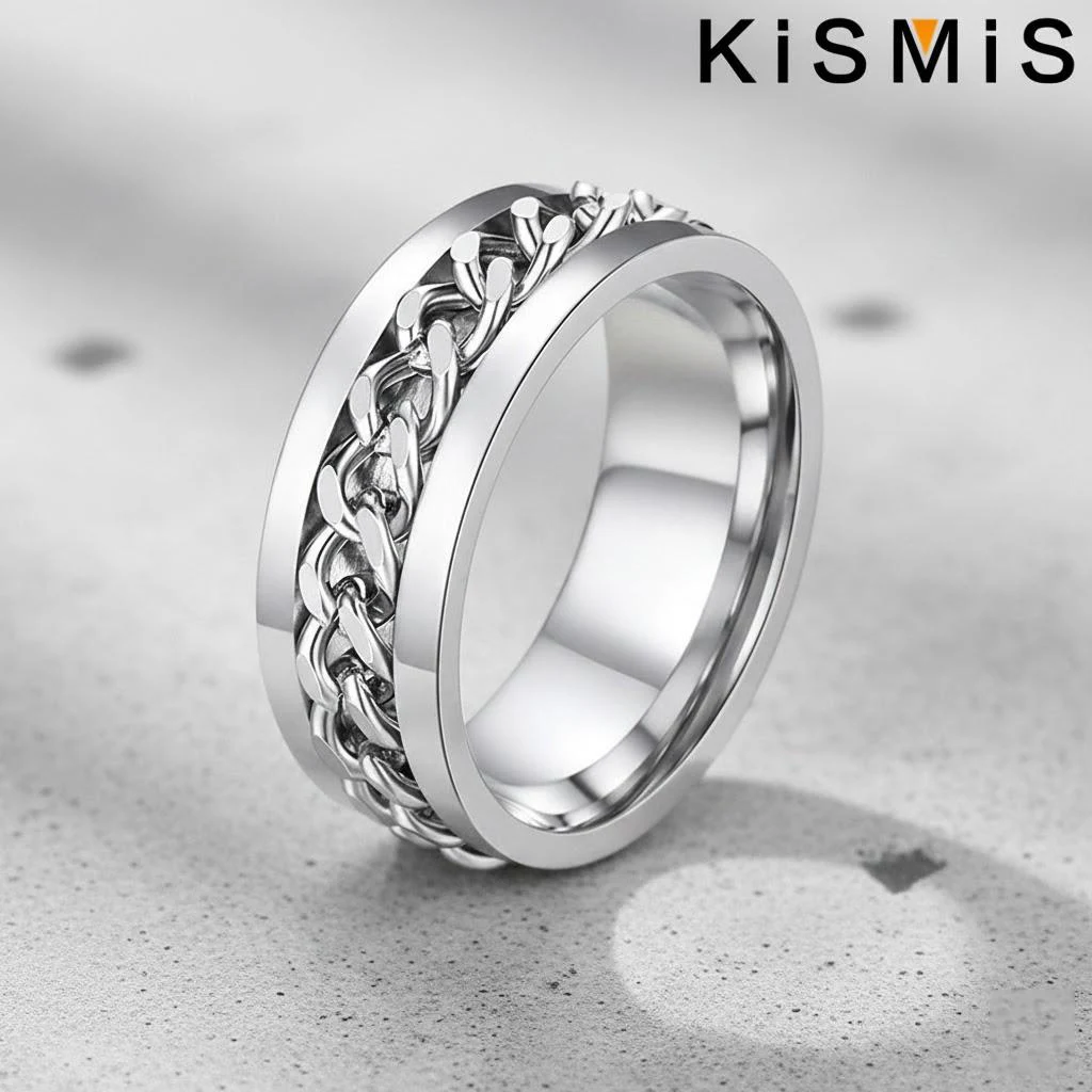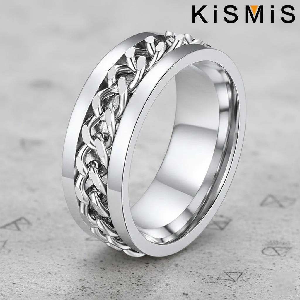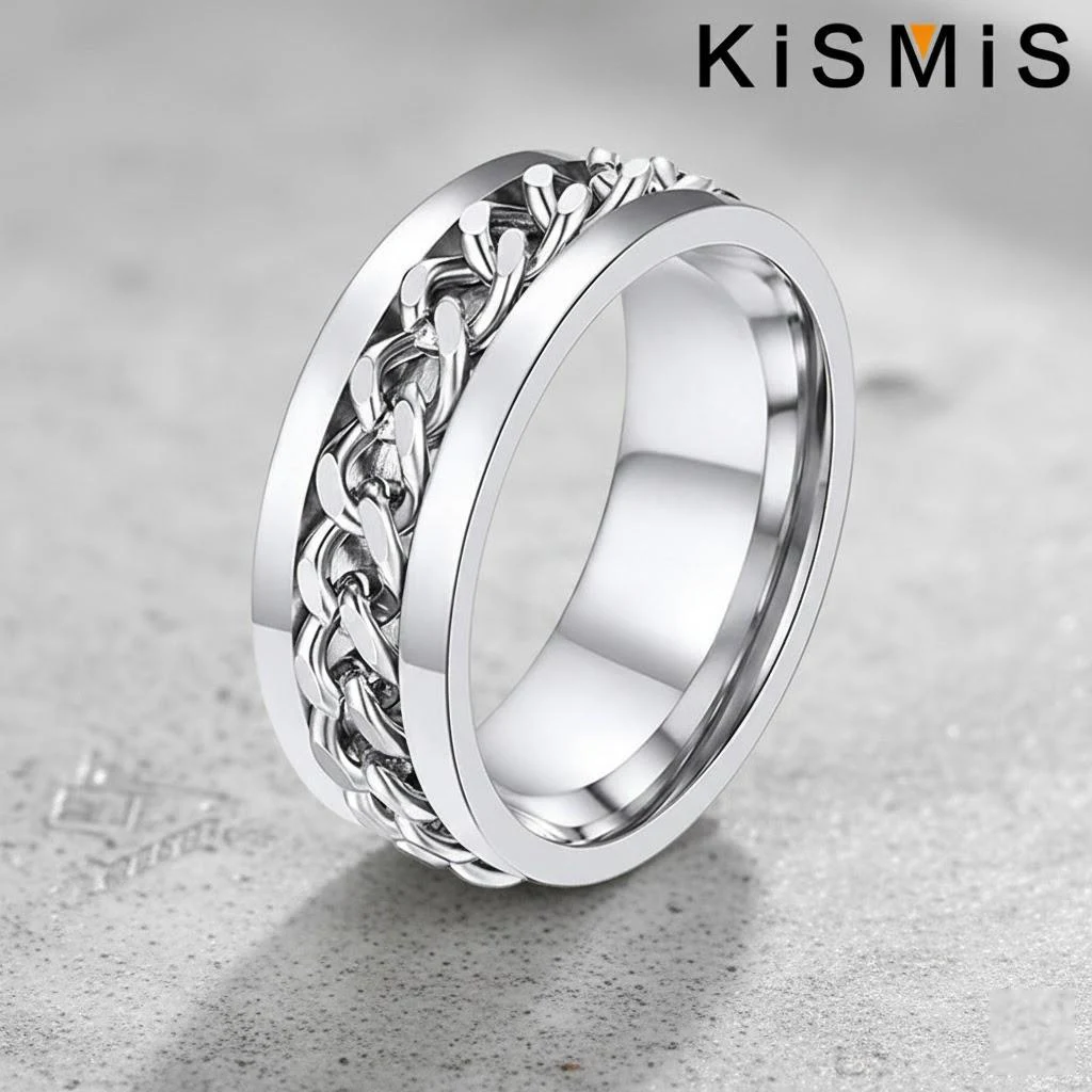 Discover the timeless appeal of this unisex stainless steel ring, expertly crafted to elevate your everyday style. Measuring 8mm in width, it features a sleek, polished silver or black finish that complements any wardrobe. The standout design element is a central chain-like motif, with rounded, interlinked links that add texture and movement. This chain is slightly recessed or raised, creating a dynamic visual contrast against the smooth, reflective band. Ideal for both men and women, this ring combines modern minimalism with durable quality, perfect for those who appreciate subtle elegance. Plus, the innovative rotatable chain feature offers a unique, interactive touch, making this jewelry an exceptional addition to your collection.