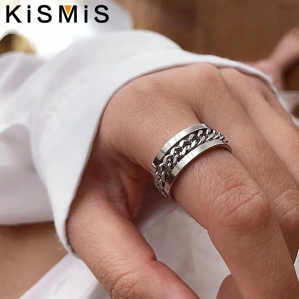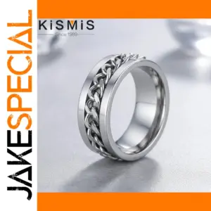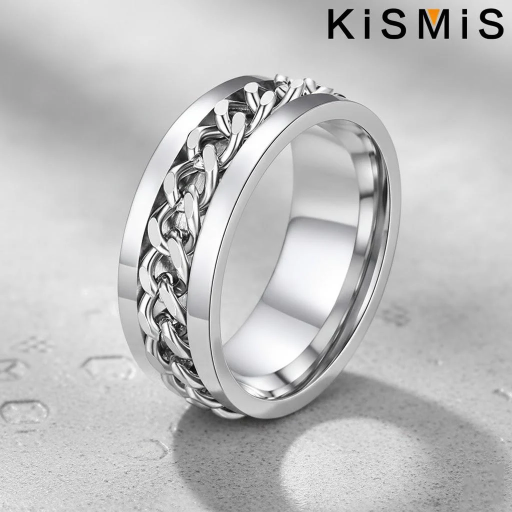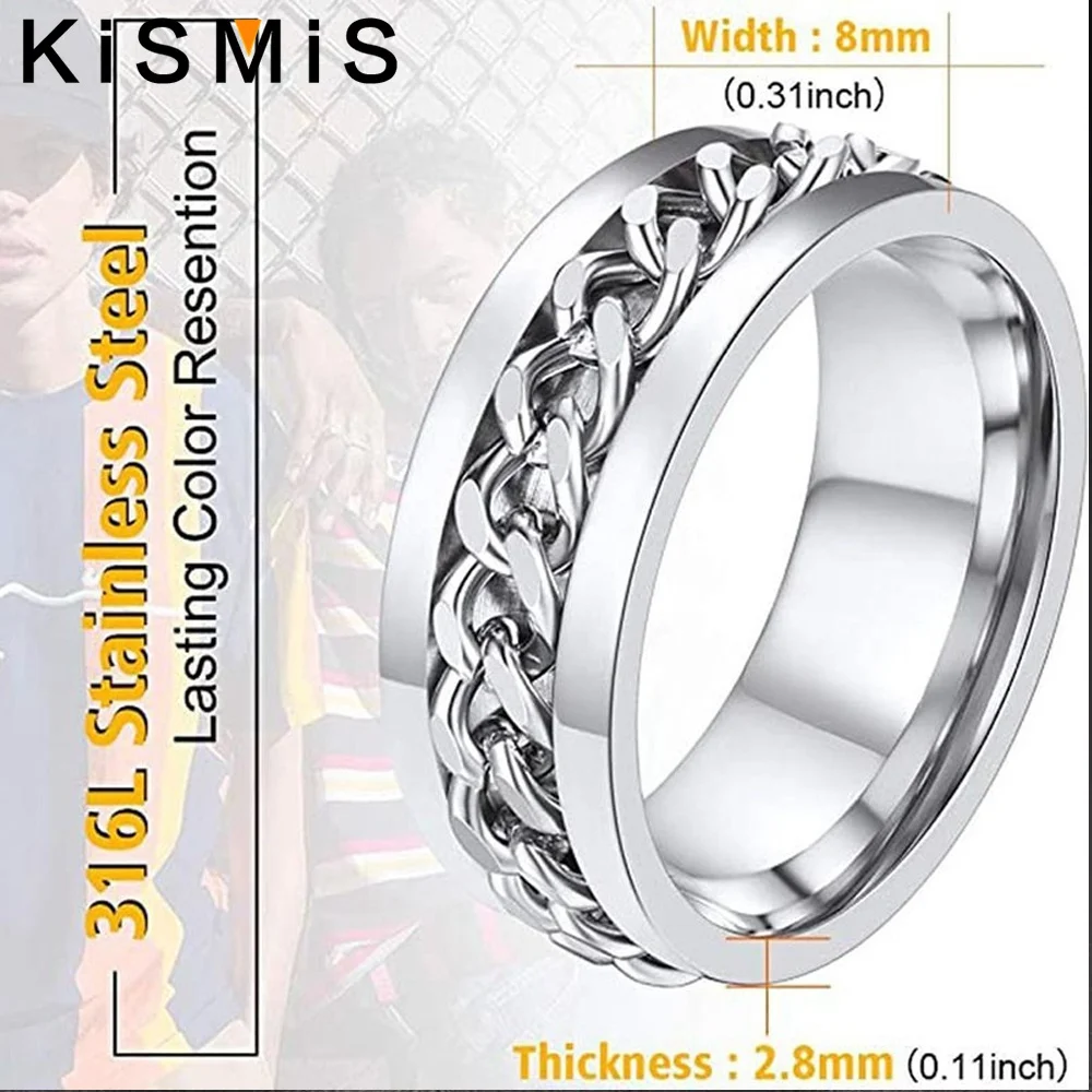 Discover the timeless appeal of this unisex stainless steel ring, expertly crafted to elevate your everyday style. Measuring 8mm in width, it features a sleek, polished silver or black finish that complements any wardrobe. The standout design element is a central chain-like motif, with rounded, interlinked links that add texture and movement. This chain is slightly recessed or raised, creating a dynamic visual contrast against the smooth, reflective band. Ideal for both men and women, this ring combines modern minimalism with durable quality, perfect for those who appreciate subtle elegance. Plus, the innovative rotatable chain feature offers a unique, interactive touch, making this jewelry an exceptional addition to your collection.