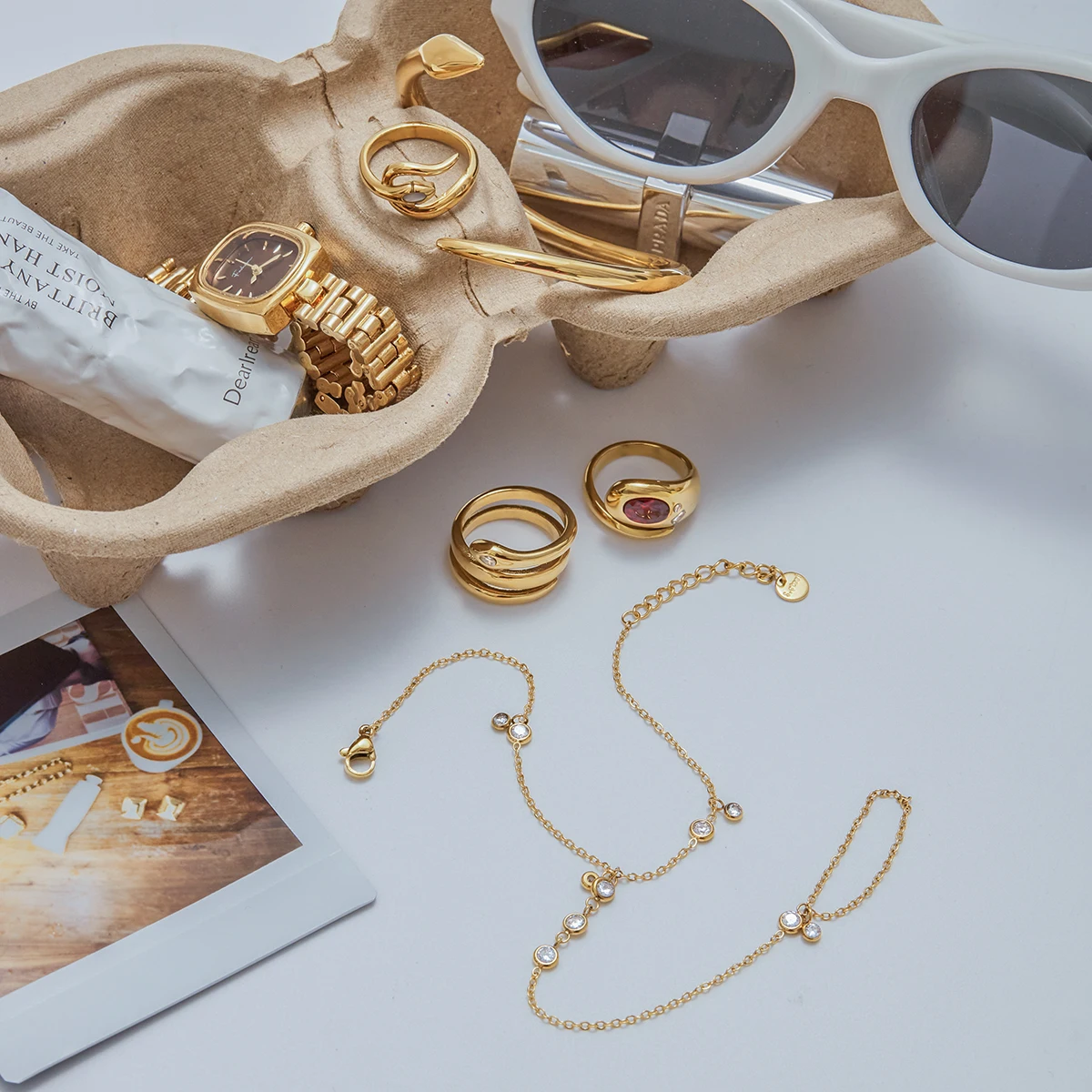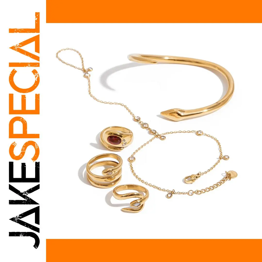 - Includes versatile jewelry pieces: smooth, layered, and animal-inspired snake-shaped rings with glossy, polished finishes, emphasizing modern elegance.