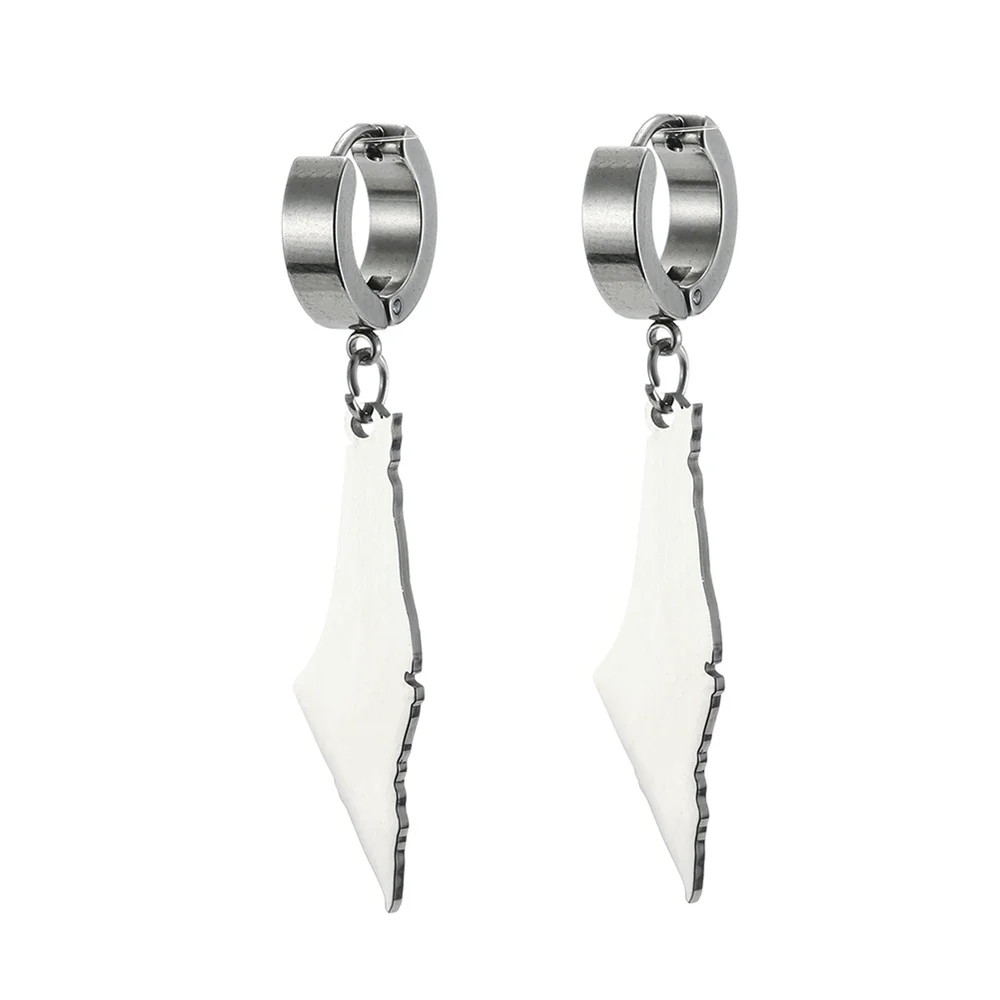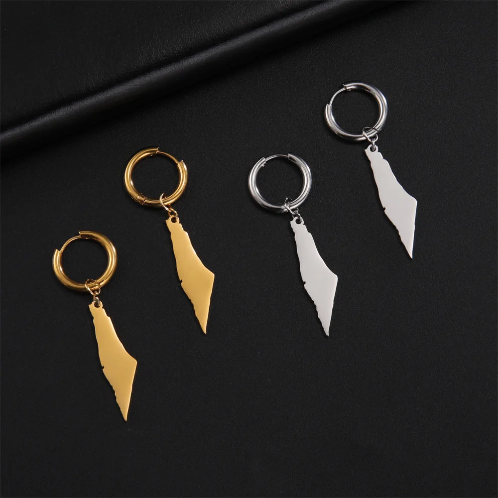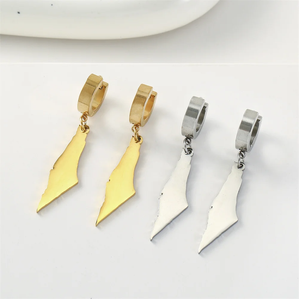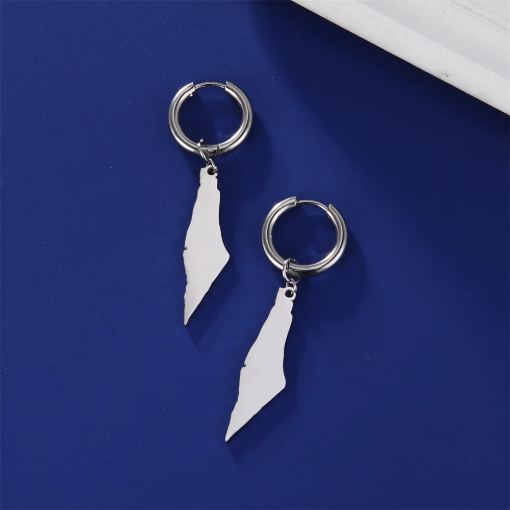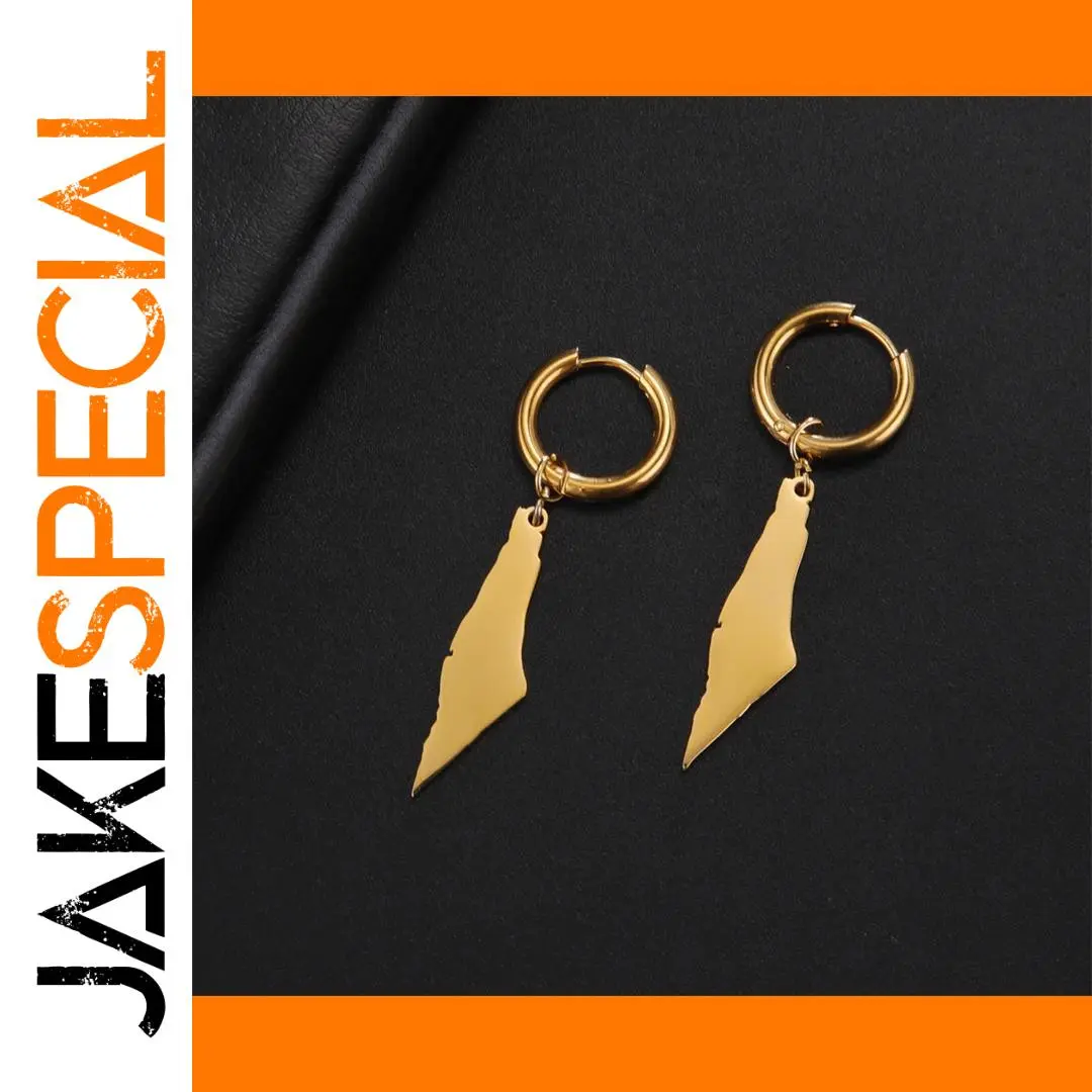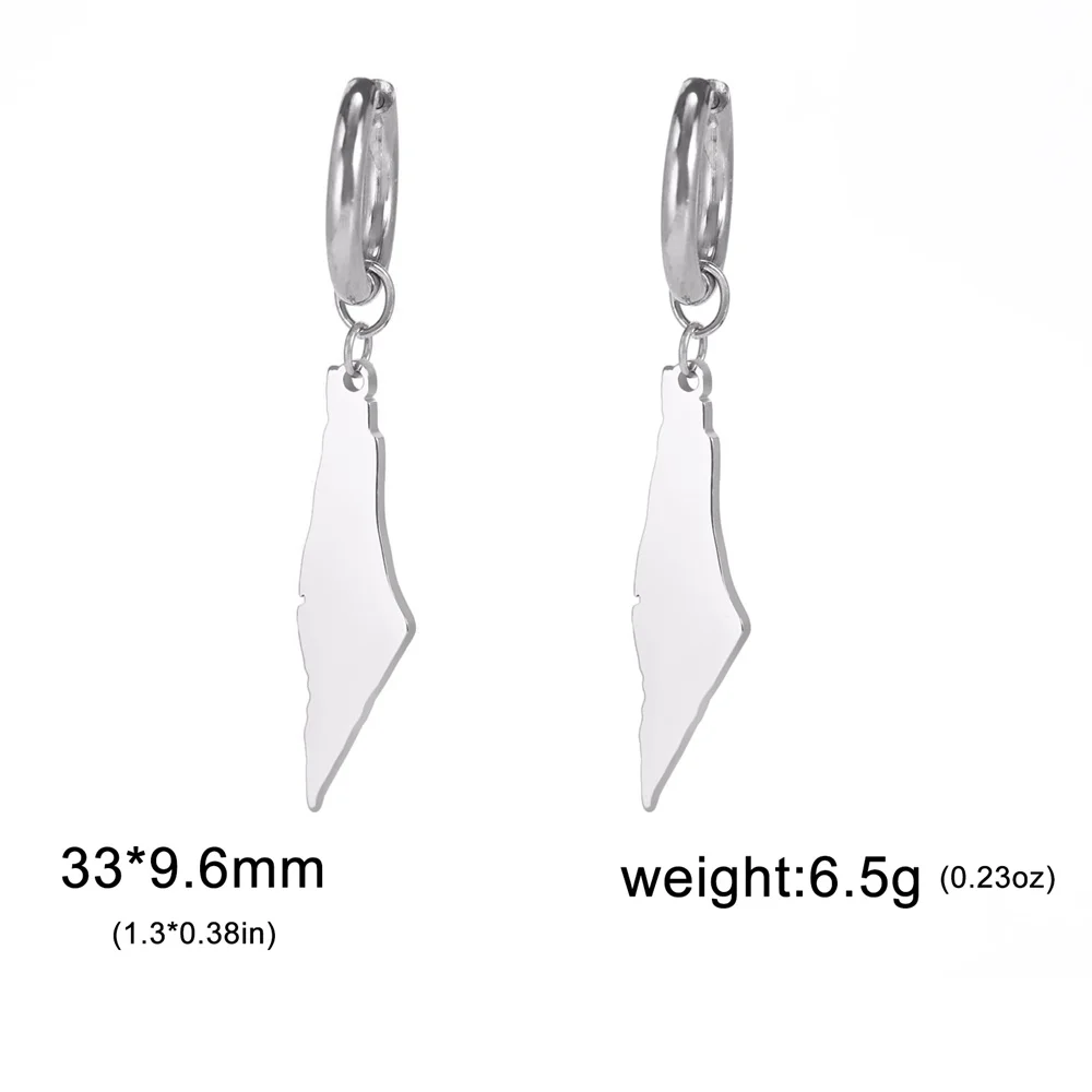 Step into modern elegance with this pair of unisex stainless steel drop earrings, showcasing a geometric Israel and Palestine map design. Measuring 33mm by 9.6mm, these earrings blend trendy, vintage, and fashionable elements to create a striking accessory for daily life or special occasions. Crafted from durable stainless steel available in sleek silver or luxurious gold, they are rust-resistant, hypoallergenic, and resistant to acids and alkali. Their minimalist geometric shape makes them versatile, suitable for weddings, parties, dates, work, or anniversaries. Adding these earrings to your collection will instantly elevate your style while providing comfort and lasting beauty, making them perfect for those who appreciate bold, contemporary jewelry with cultural significance.