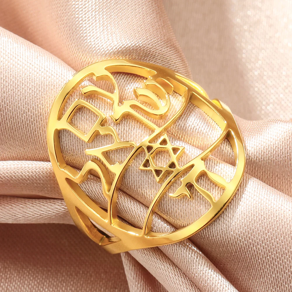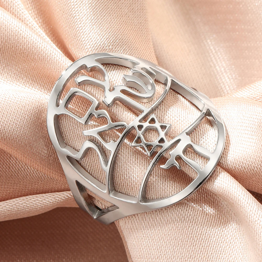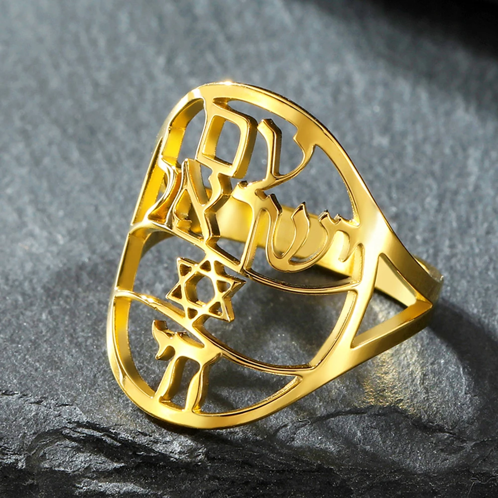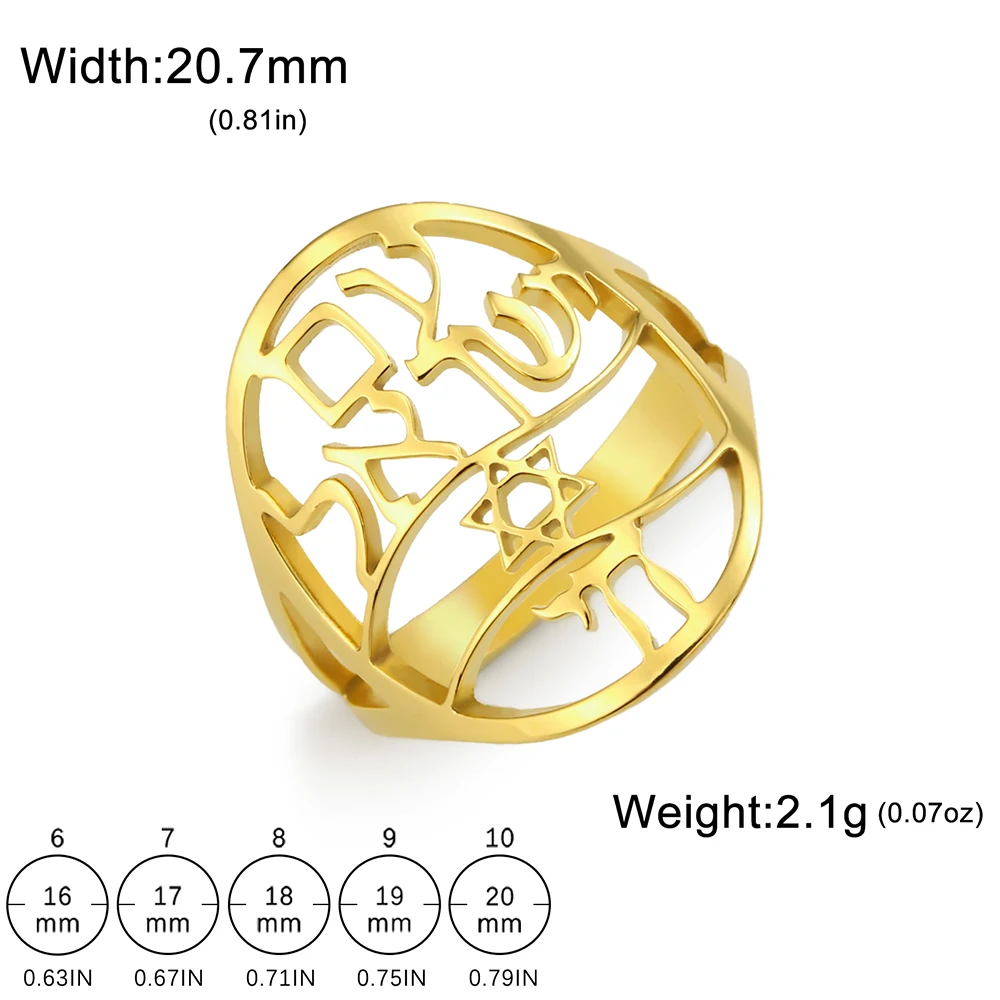 This unisex stainless steel ring features a sleek 2mm wide surface with a geometric design that prominently displays the Hebrew phrase “Am Yisrael Chai,” alongside the Star of David and Chai symbols, representing Jewish faith and resilience. Finished with either steel or gold-colored plating, it offers a modern yet meaningful aesthetic suitable for various occasions such as anniversaries. Crafted with high-quality stainless steel, the ring is available in sizes 6 (16cm), 7 (17cm), 8 (18cm), 9 (19cm), 10 (20cm), and 11 (21cm). Its polished surface and symmetrical pattern provide a sophisticated look, making it a powerful symbol of heritage and identity for all wearers.