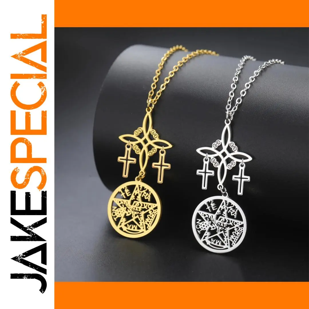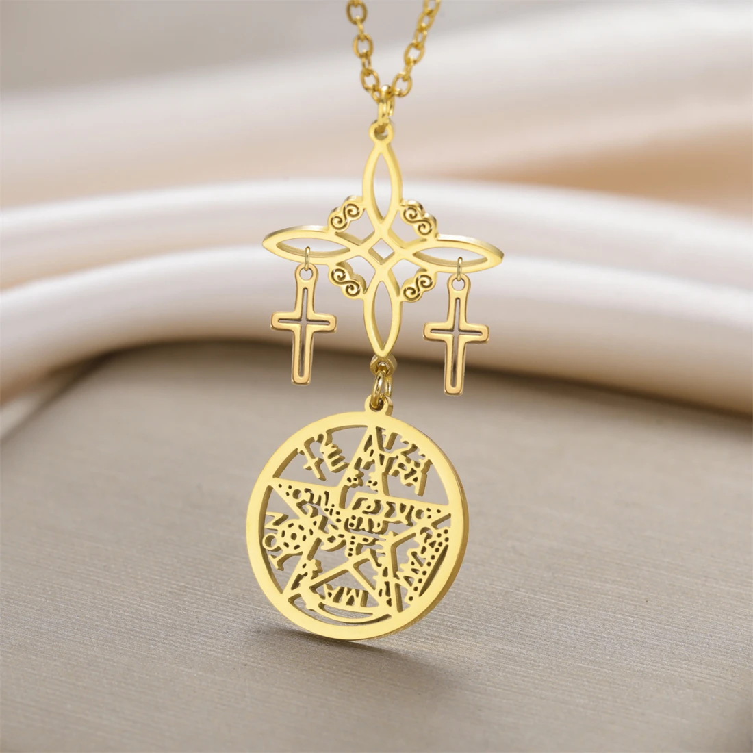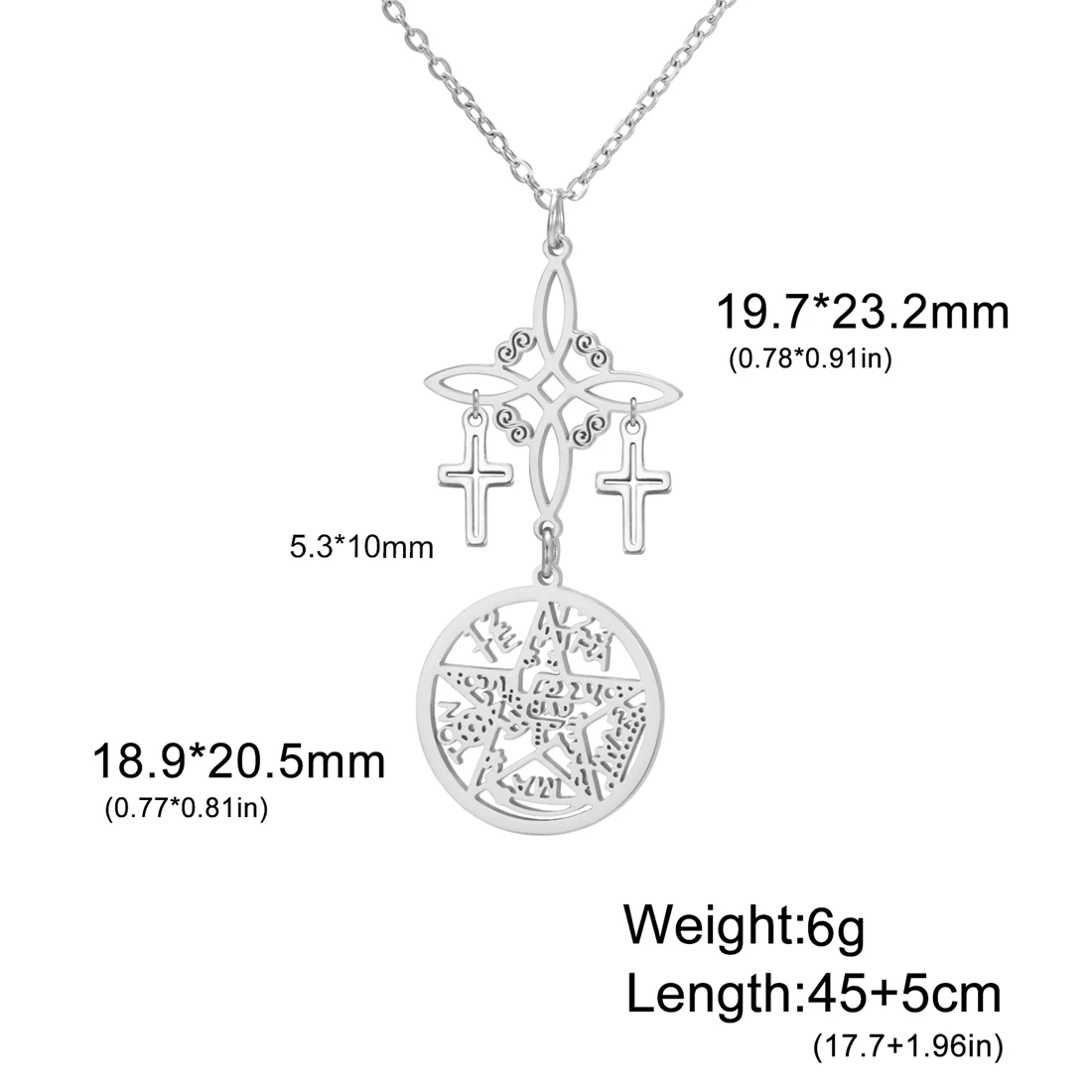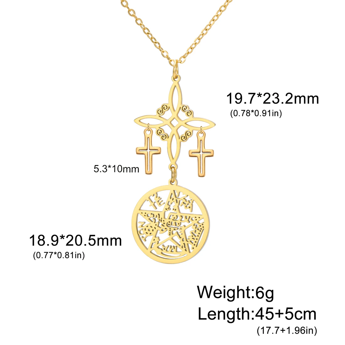 Experience the elegance and symbolism of this this unisex stainless steel necklace, measuring 45+5 cm. The beautifully crafted chain features a sleek link design, available in eye-catching gold or silver hues. The circular pendant combines intricate geometric motifs, including a Witch Knot, Pentacle, and Tetragrammaton, creating a detailed and ornate appearance. Its durable construction ensures resistance to rust, acids, alkali, deformation, and fading, thanks to high-quality stainless steel and REACH certification. Perfect for various occasions, this jewelry blends vintage charm with minimalist and fashionable styles, making it an ideal gift or personal accessory. Elevate your look with this unique piece that symbolizes protection and spiritual significance, all while maintaining a sleek, modern aesthetic.