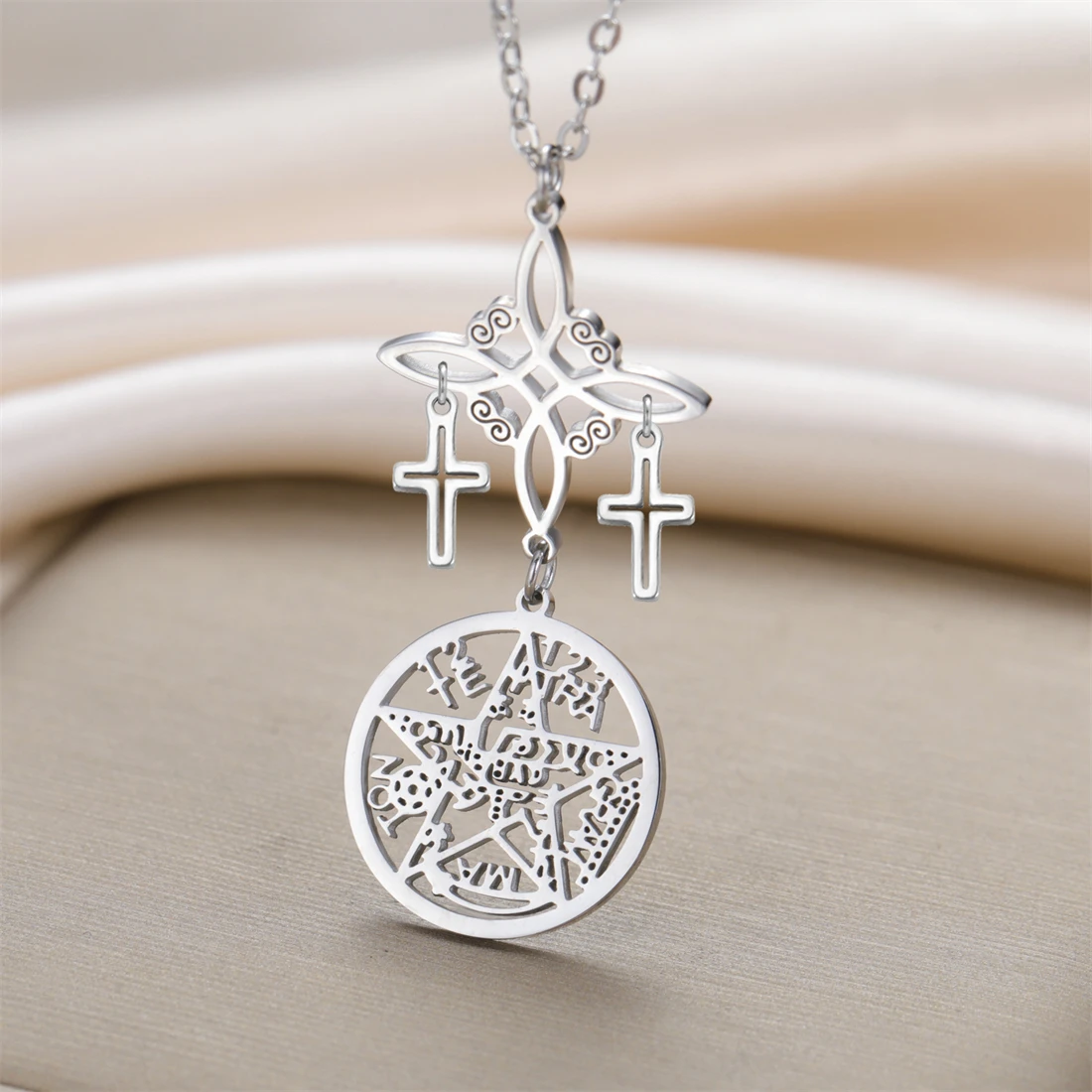 - The circular pendant features a detailed geometric pattern combining a Witch Knot, Pentacle, and Tetragrammaton symbols, crafted with precision to enhance its ornate visual appeal.