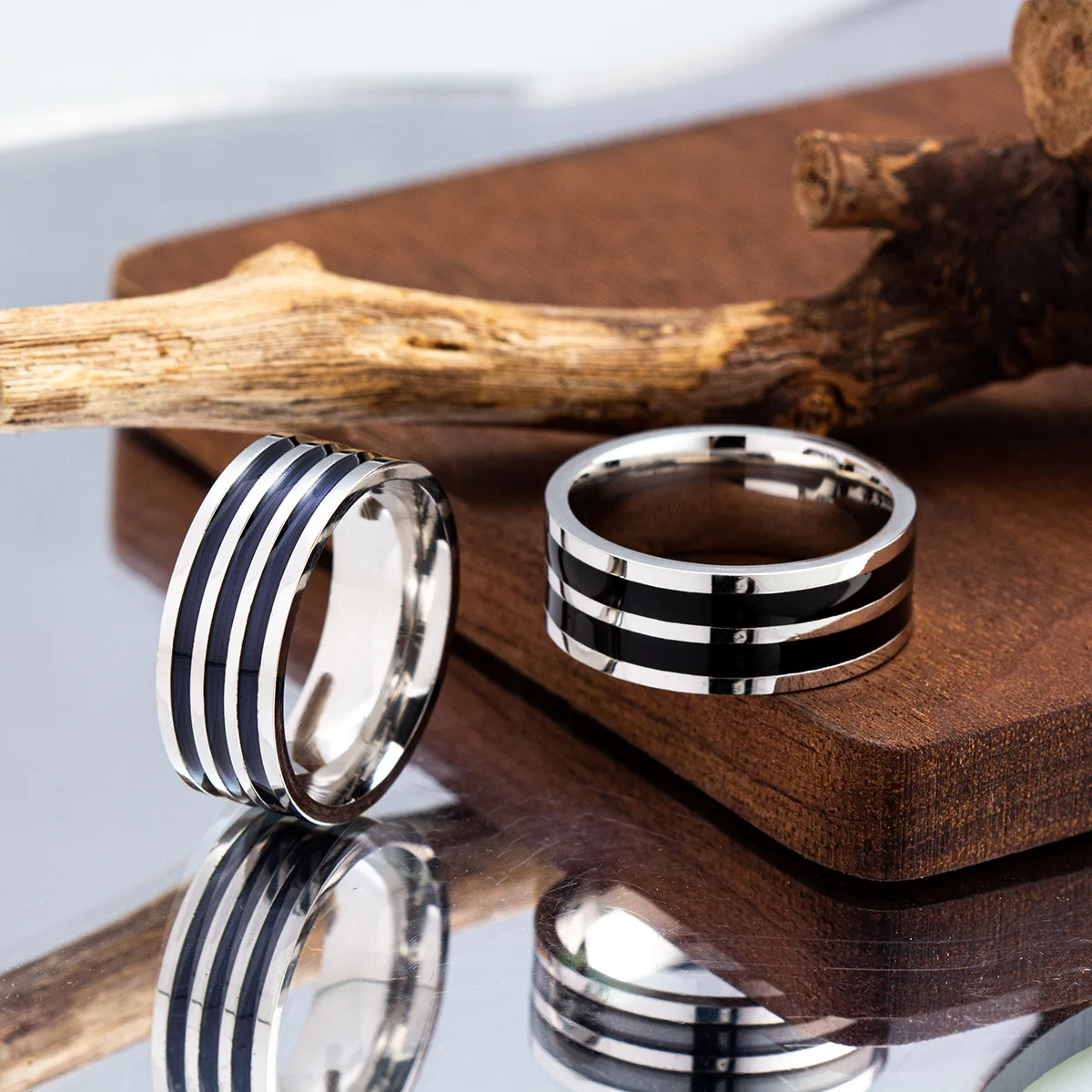 Discover the elegance of this unisex stainless steel wedding ring, designed to symbolize your commitment with a modern touch. Featuring a sleek, polished surface, the ring comes in widths of 6mm or 8mm, perfect for both men and women. Its round shape with a bold striped inlay offers a striking contrast of black moissanite within a shiny metallic band. Available in a variety of sizes from 5 to 12, it makes for an ideal wedding or anniversary gift that combines durability and style. Whether you’re attending a special event or celebrating a milestone, this ring’s contemporary design ensures it will stand out and complement any occasion. Easy to wear and maintain, it’s a choice that provides confidence and sophistication.