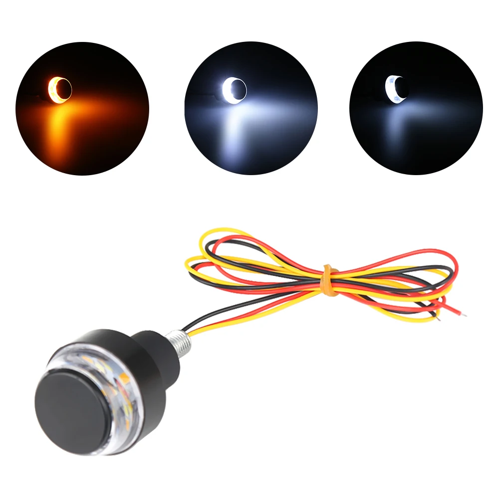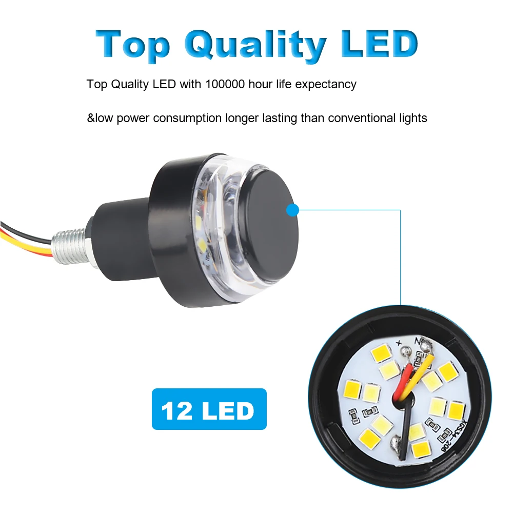 Experience enhanced safety and style with this set of two motorcycle handlebar turn signals, crafted with sleek black ABS and high-transparency lenses that shine brightly in yellow, blue, or white. Designed for universal 22mm handlebars, these LED blinkers are perfect for a wide range of motorcycles and e-bikes. The durable aluminum body ensures rapid heat dissipation, maintaining performance during long rides. These compact, minimalist lights blend seamlessly into your motorcycle's control area, adding a modern touch while providing clear, highly visible signals for safety. Easy to install and lightweight, they’re ideal for both upgrading your ride’s aesthetic and enhancing nighttime visibility, ensuring you ride confidently on every journey.