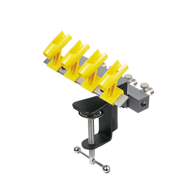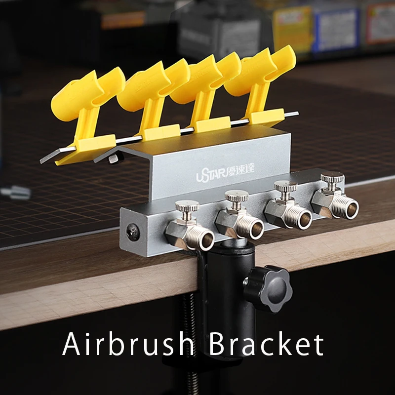 Transform your workspace with this sleek, clamp-style universal airbrush holder designed to accommodate four airbrushes simultaneously. Featuring an elegant black painted finish paired with a durable metallic base, this tool exudes modern industrial style while providing practical functionality. The four vibrant yellow plastic clips securely hold airbrushes by their barrels or handles, each with a curved, open-ended design for easy access. Independent airflow regulators and adjustable outlets ensure precise airflow control tailored to your artistic needs, whether working on scale models, anime figures, sci-fi projects, or DIY dolls. This holder is crafted to meet high standards, offering a professional setup that enhances efficiency and creativity in your artistic endeavors.