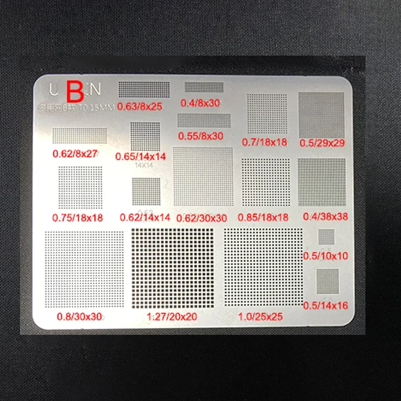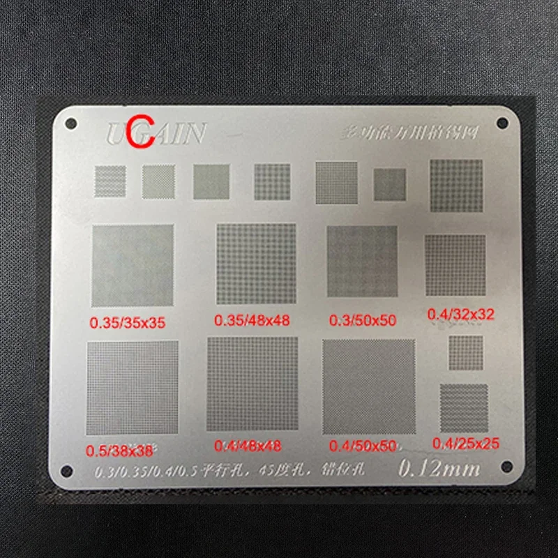 This high-quality universal BGA reballing stencil set features three metal sheets in options A, B, and C, with a sleek, industrial design finished in matte or semi-gloss. Each stencil has precisely cut square holes of various sizes, including 0.5/10×16 mm, 0.63/8×25 mm, and 0.35/4×48 mm, arranged in an organized grid pattern, ideal for reballing CPU and IC chips on mobile phones and laptops. Made with durable material available in thicknesses of 0.12mm or 0.15mm, these stencils are suitable for direct heating applications. Packaged in a bag, this versatile 3-in-1 set ensures professional, accurate reballing for high-precision electronics repair.