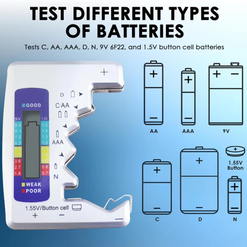 - This diagnostic tool supports testing a wide range of batteries, including C, D, N, AA, AAA, 9V (6F22), and button cells like SR44 and LR44 (1.55V), ensuring versatility for all your needs.