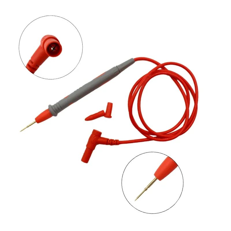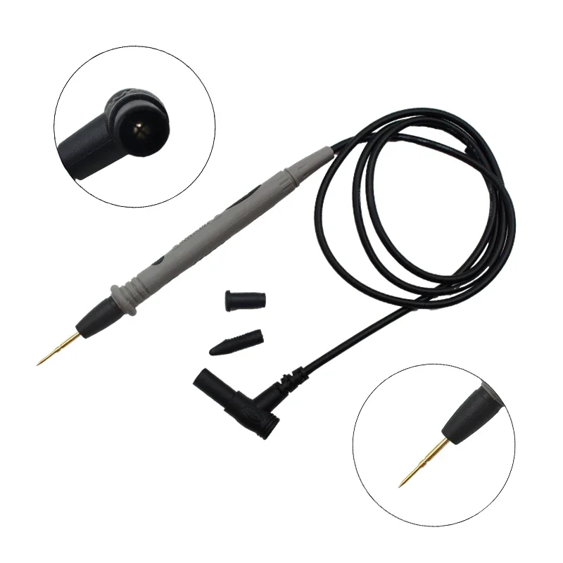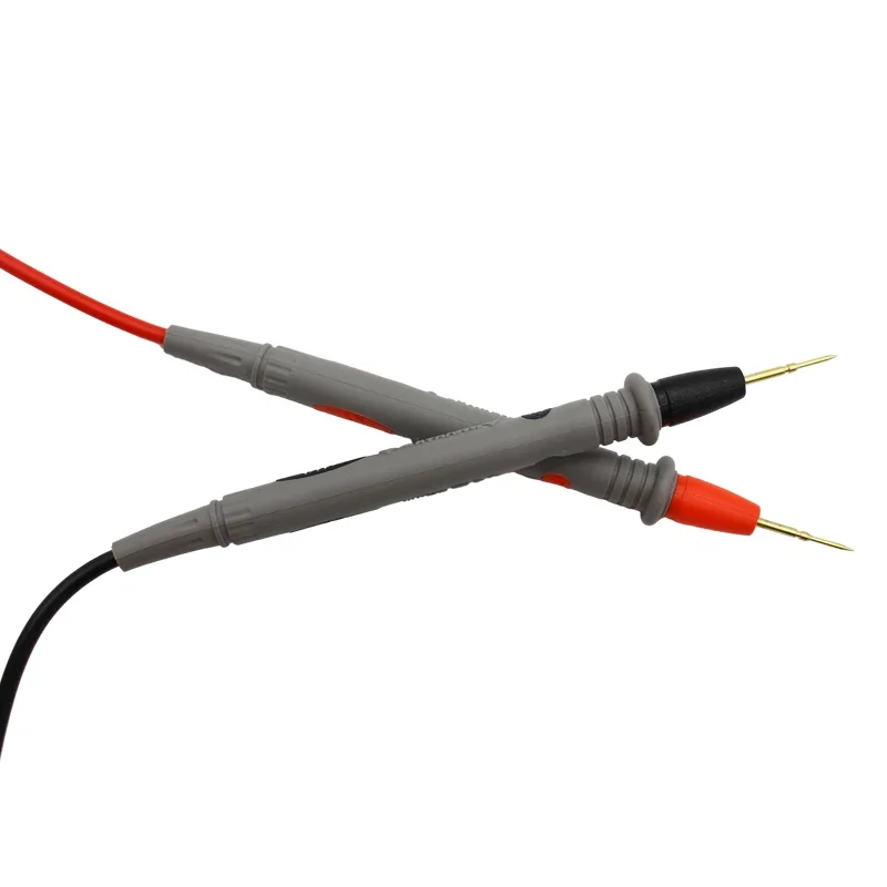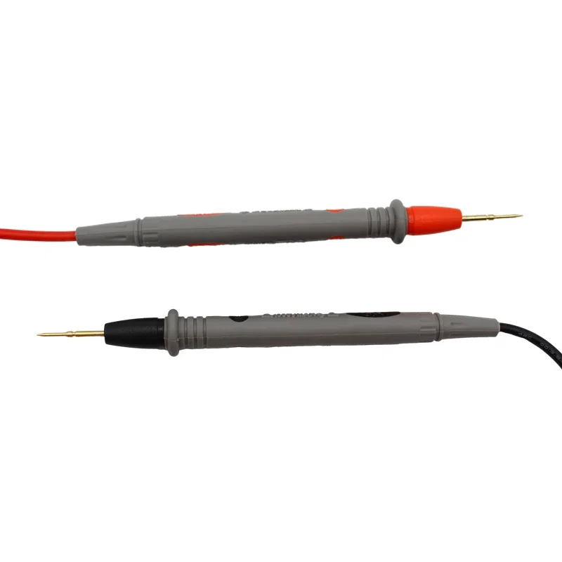 Designed for precision testing, this pair of universal test probe leads features gilded sharp contact tips and a 90cm cable length, ensuring excellent electrical conductivity and durability. Rated for a maximum current of 20A and a test voltage of up to 1000V, these probes are compatible with most digital multimeters and ideal for testing IC components. The set includes one black and one red probe, each with reinforced strain reliefs near the tips for added protection and longevity. Their sleek, cylindrical gray bodies with textured grips provide a comfortable handling experience, making them perfect for professional or hobbyist electronic testing.