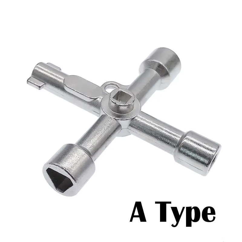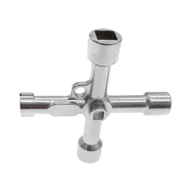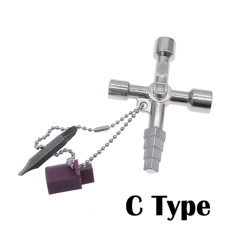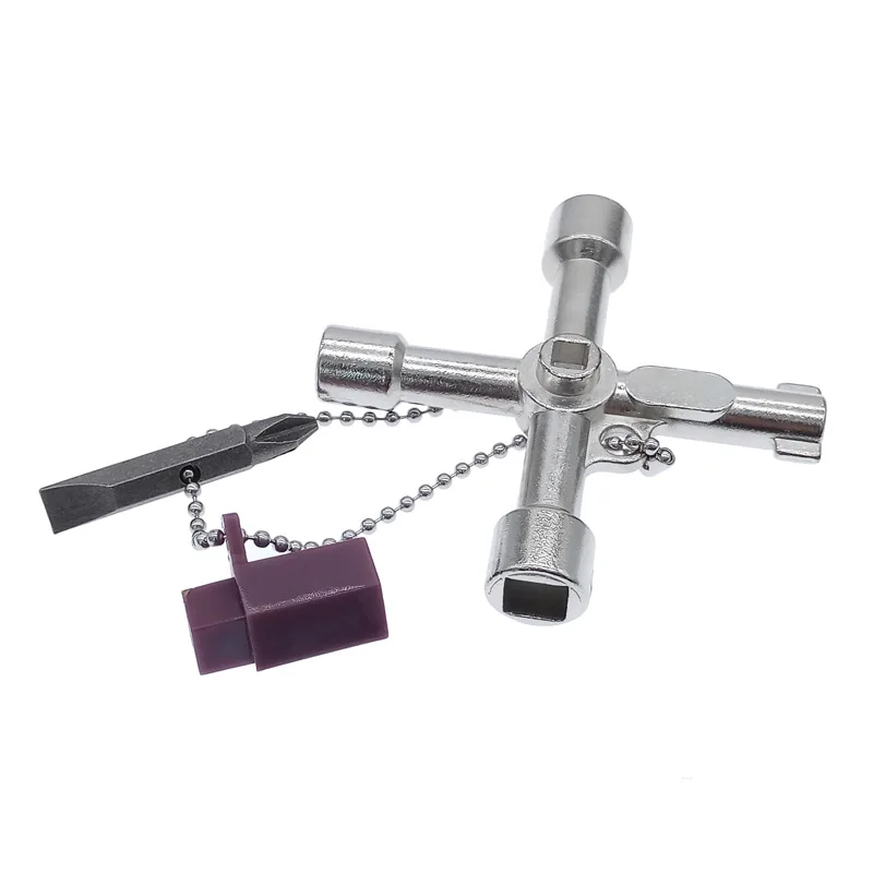 Experience reliable control with this this universal electrical cabinet key, designed for seamless operation across various lock systems. Crafted with a sturdy metal body finished in a sleek, shiny silver, it embodies durability and modern industrial aesthetics. Its distinctive triangular wrench shape features four symmetrically arranged cylindrical arms, providing a precise cross pattern that ensures a firm grip and easy turning. Attached to the central hub by a small silver ball chain, the key includes a colorful purple rectangular component with an open hexagonal hole, adding a practical touch for identification or safety. The black pointed component connected by the chain may serve operational purposes, enhancing functionality. Compact yet robust, this key is your trusted tool for electrical and elevator cabinet security.