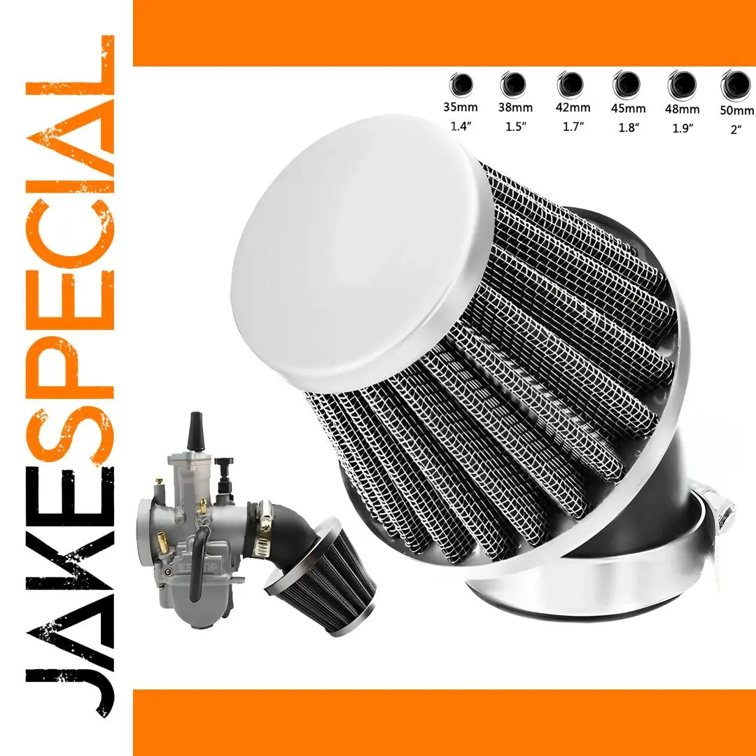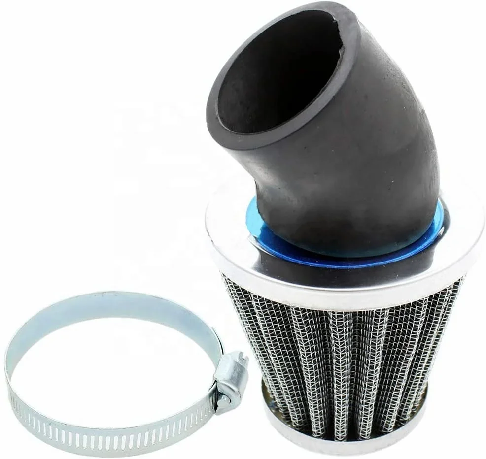 Experience a reliable upgrade to your motorcycle’s airflow system with this versatile universal air filter. Crafted with a durable black exterior, it features a carefully pleated fabric design that ensures maximum filtration and high airflow efficiency. The 45-degree angled neck allows seamless installation on a variety of bikes, scooters, ATVs, and pit bikes, providing a snug and secure fit. The removable splash-proof cover offers extra protection from water and debris, prolonging the filter’s lifespan. Equipped with a silver-colored metal clamp and a rubber gasket, installation is straightforward and leak-free. This high-quality component combines utility with rugged aesthetics, delivering enhanced engine performance and increased durability for your rides.