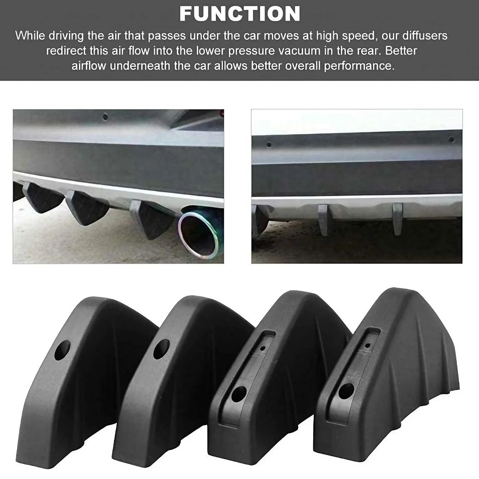 - Manufactured with technical precision, the diffusers measure to fit most vehicle bumpers, with mounting holes and hardware specifically designed for secure, reliable attachment.