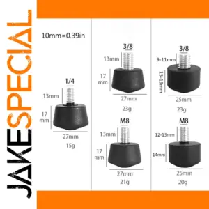 - Technical specifications include: size 27x17x13mm, compatible with 1/4″, 3/8″, and M8 screw sizes, made of rubber and metal, black color, includes 1 piece per package.