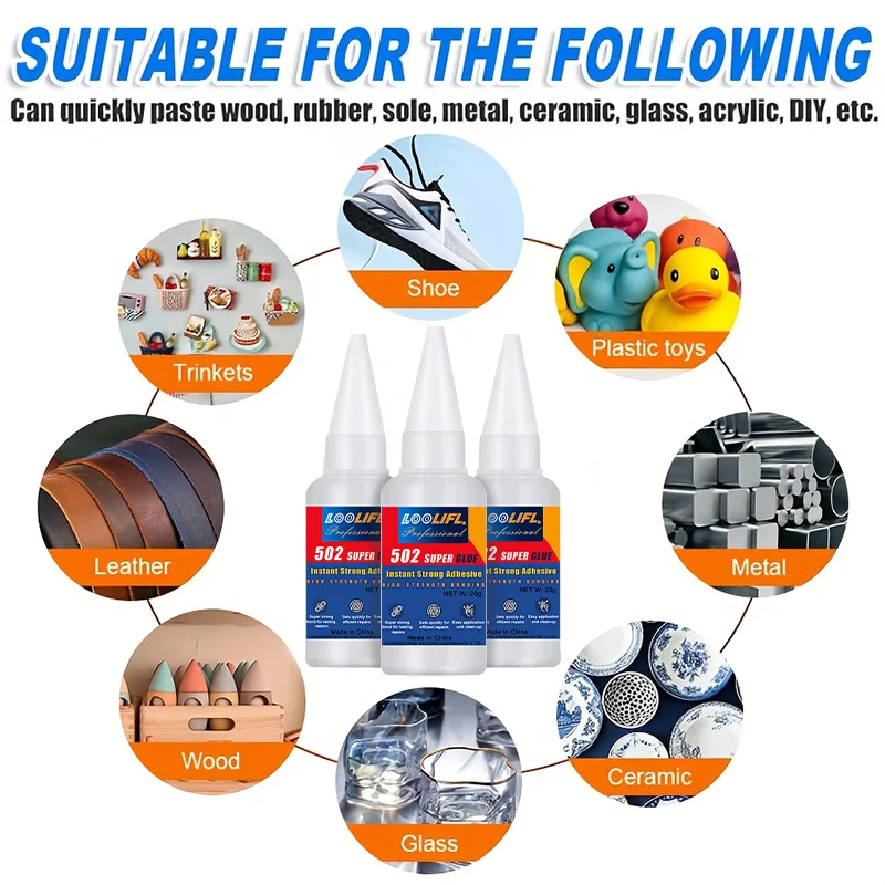 Experience rapid, high-strength bonding with this 20ml super universal liquid glue, designed for adult collectors and enthusiasts. It sets securely within 2-5 seconds and becomes waterproof after 24 hours, making it ideal for bonding a variety of materials including metal, plastic, ceramics, rubber, acrylic, wood, glass, and leather. Featuring an anti-clogging cap for precise application and minimal waste, the glue offers adjustable viscosity for different projects. Its sleek, modern bottle design emphasizes ease of use, speed, and high-performance adhesion, ensuring your repairs and crafting are quick, reliable, and professional-looking.