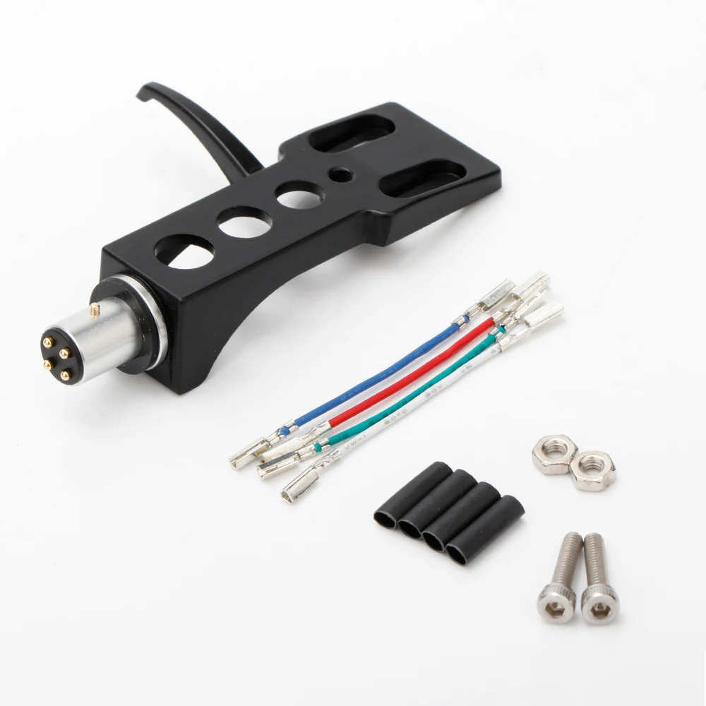 Step into your vinyl playback experience with this durable, metal turntable headshell mount, designed for professional DJs and audiophiles alike. Available in sleek black and silver finishes, its elongated rectangular shape with rounded edges offers a modern, minimalist aesthetic. The oval cutouts along the body reduce weight without compromising strength, ensuring reliable performance. The cylindrical connector with gold pins guarantees a secure connection to your cartridge, while the included four color-coded wires facilitate easy, tidy wiring. Sized at 65mm in mount length, this product ensures stability and precision when installing cartridges, providing excellent low and high-frequency audio reproduction. Perfectly compatible with a variety of turntables, including Technics 1200 models, this mount elevates your vinyl setup to professional standards.