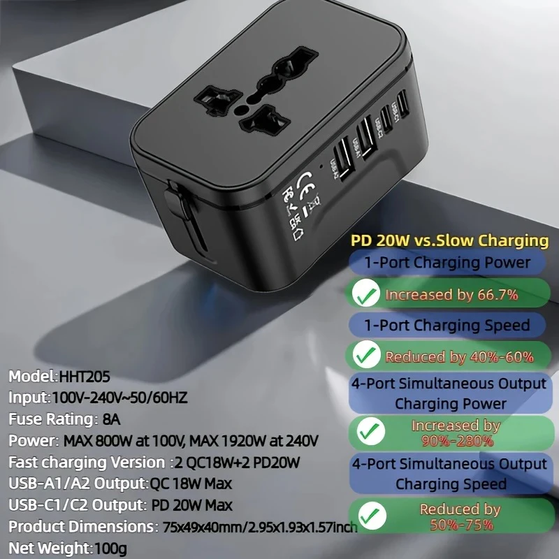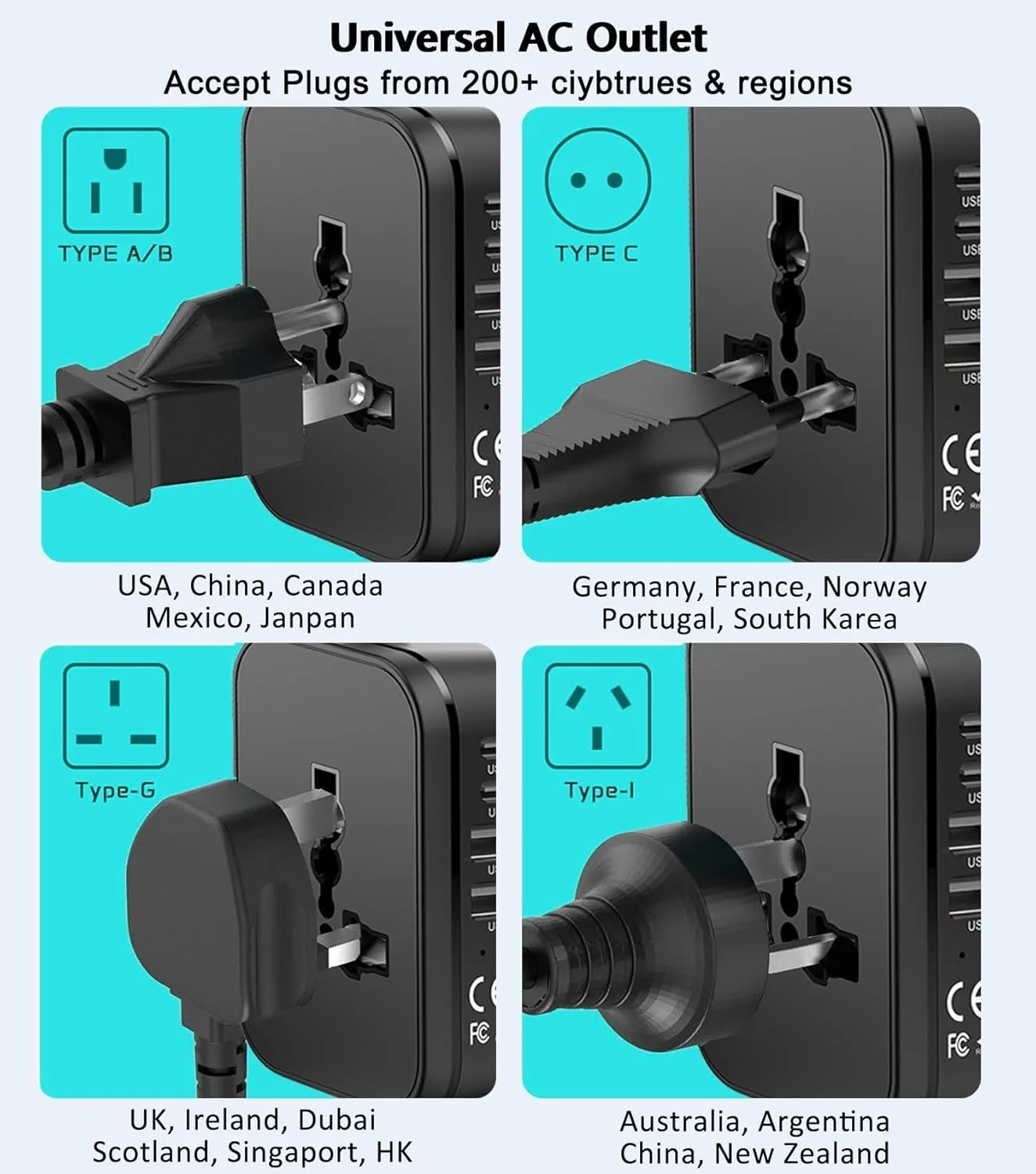 - The universal plug outlet is compatible with over 200 countries including the USA, UK, Europe, and Australia, ensuring worldwide usability.