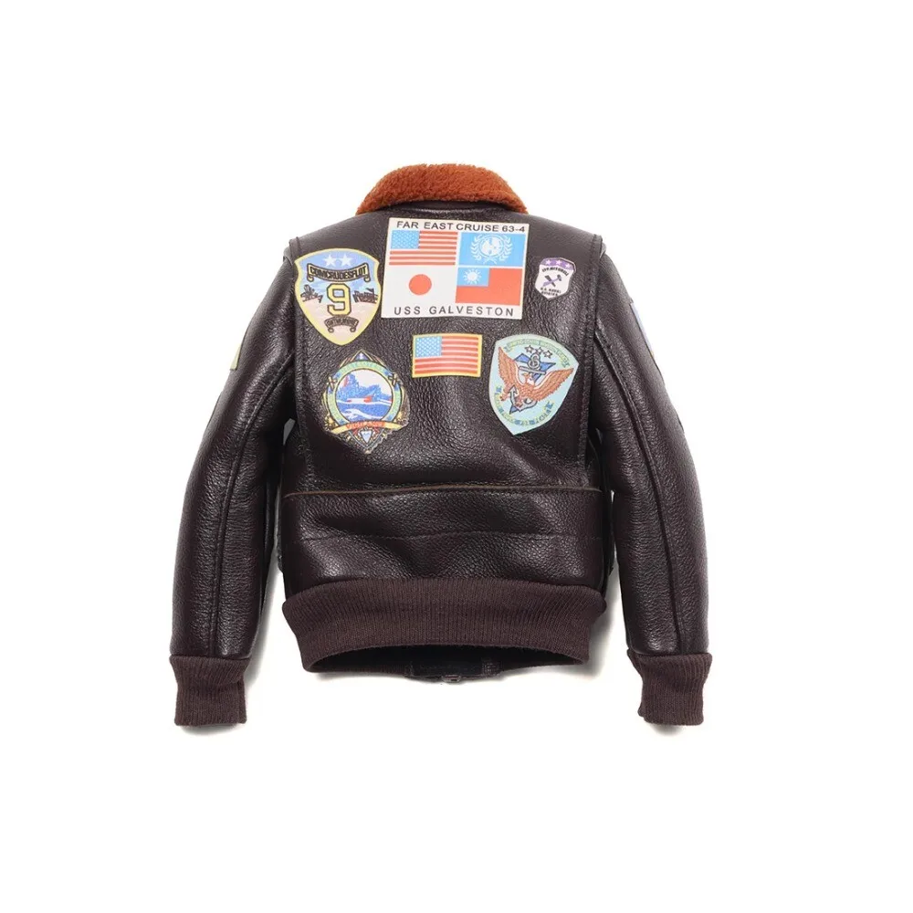 Imagine elevating your 12-inch action figure collection with this meticulously crafted leather flight jacket. Designed specifically for US Navy pilots, this jacket offers an impressive level of detail, from its textured dark brown or black leather surface that replicates real materials to the plush faux fur collar in rich, reddish-brown, adding warmth and vintage appeal. Embroidered patches in vibrant colors, including ships, flags, and military emblems, are carefully sewn onto the surface, creating a strikingly realistic military aesthetic. The jacket features functional pocket flaps, ribbed cuffs, and a zip-up front that enhances its authenticity. This high-quality accessory is perfect for collectors seeking a durable, visually impressive addition to their display.
