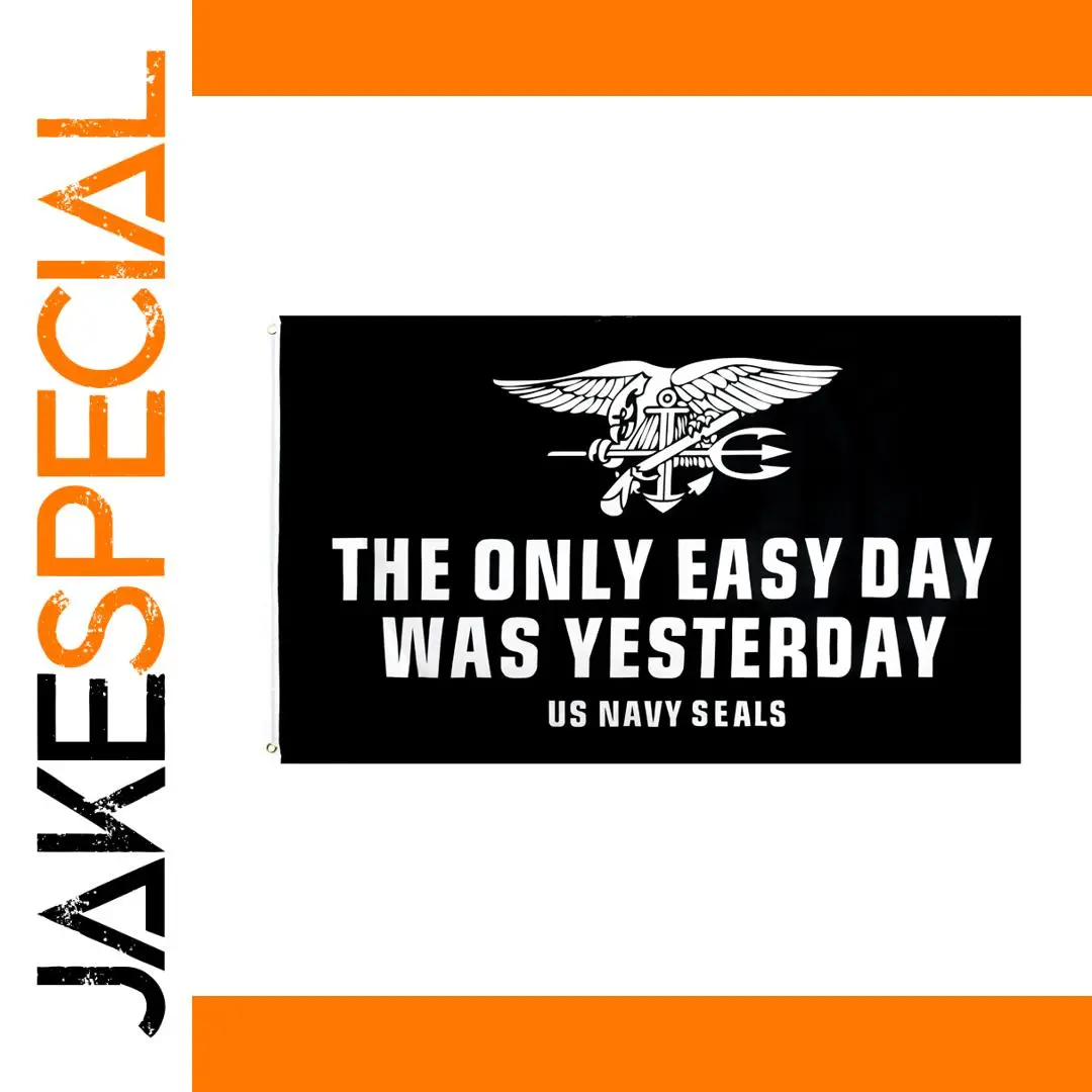 Imagine adding a powerful piece of decor to your space that truly reflects strength and patriotism. This high-quality 90x150cm polyester flag features a striking black background accented by a detailed white emblem of an eagle clutching a trident and olive branch. Beneath the emblem, bold white capitalized text reads “THE ONLY EASY DAY WAS YESTERDAY,” complemented by smaller white script “US NAVY SEALS.” Its smooth surface with hemmed edges offers a sleek, polished look, perfect for hanging indoors or outdoors. Durable double-stitched craftsmanship ensures years of display. This flag not only makes a statement but also showcases your admiration for the elite Navy SEALs, adding a commanding presence to any setting.
