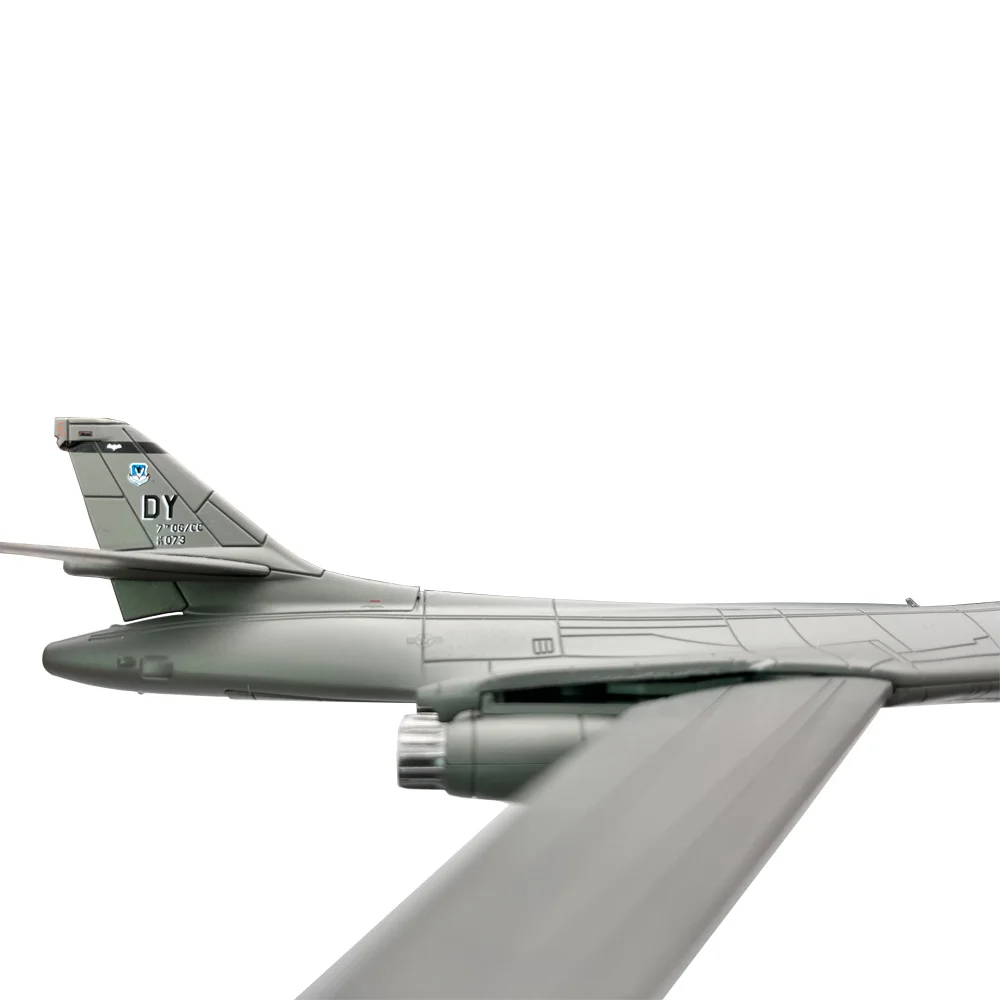Explore the highly detailed 1:200 scale diecast metal model of the US Rockwell B-1B Lancer strategic bomber, featuring a sleek matte light gray finish and meticulous surface details. Weighing approximately 400 grams, it measures 8.46″ in length, 7.48″ in width, and 2.36″ in height. The model includes a functional transformable swept-wing design, twin detailed jet engines with metallic silver exhaust nozzles, and a tall tail fin with distinctive markings. Mounted on a clear, curved plastic stand, it captures the aircraft’s dynamic spirit perfectly. Crafted from high-quality alloy, with engineering plastic tires and a sturdy base, this collectible is ideal for military aviation enthusiasts.