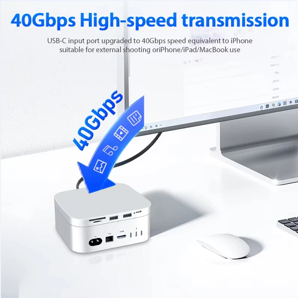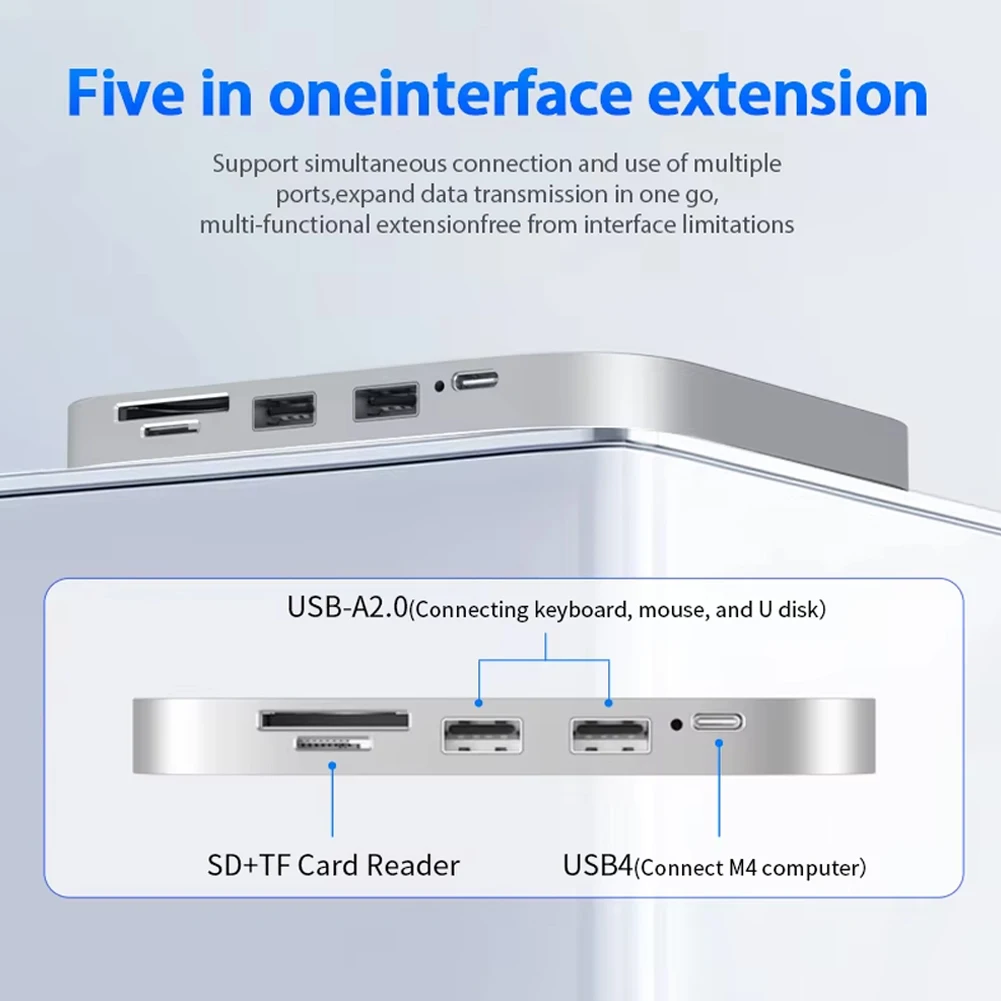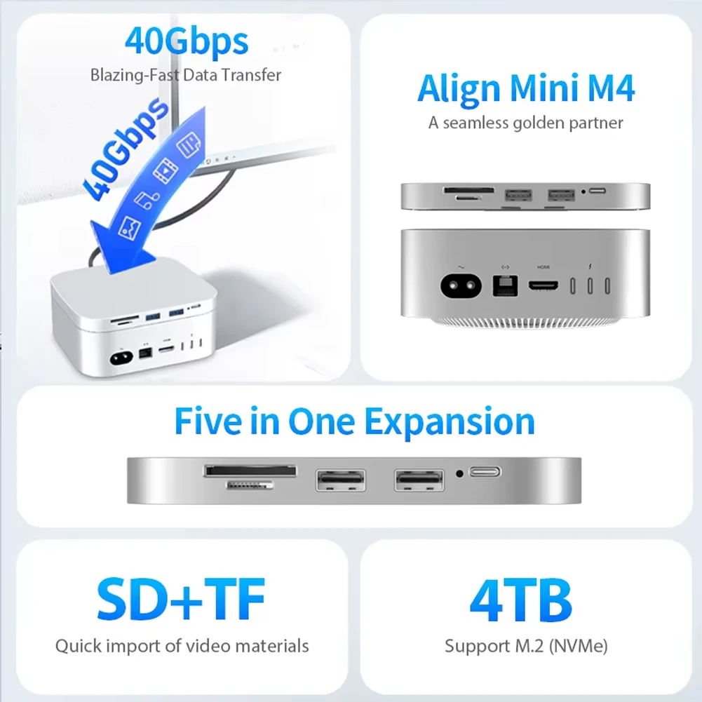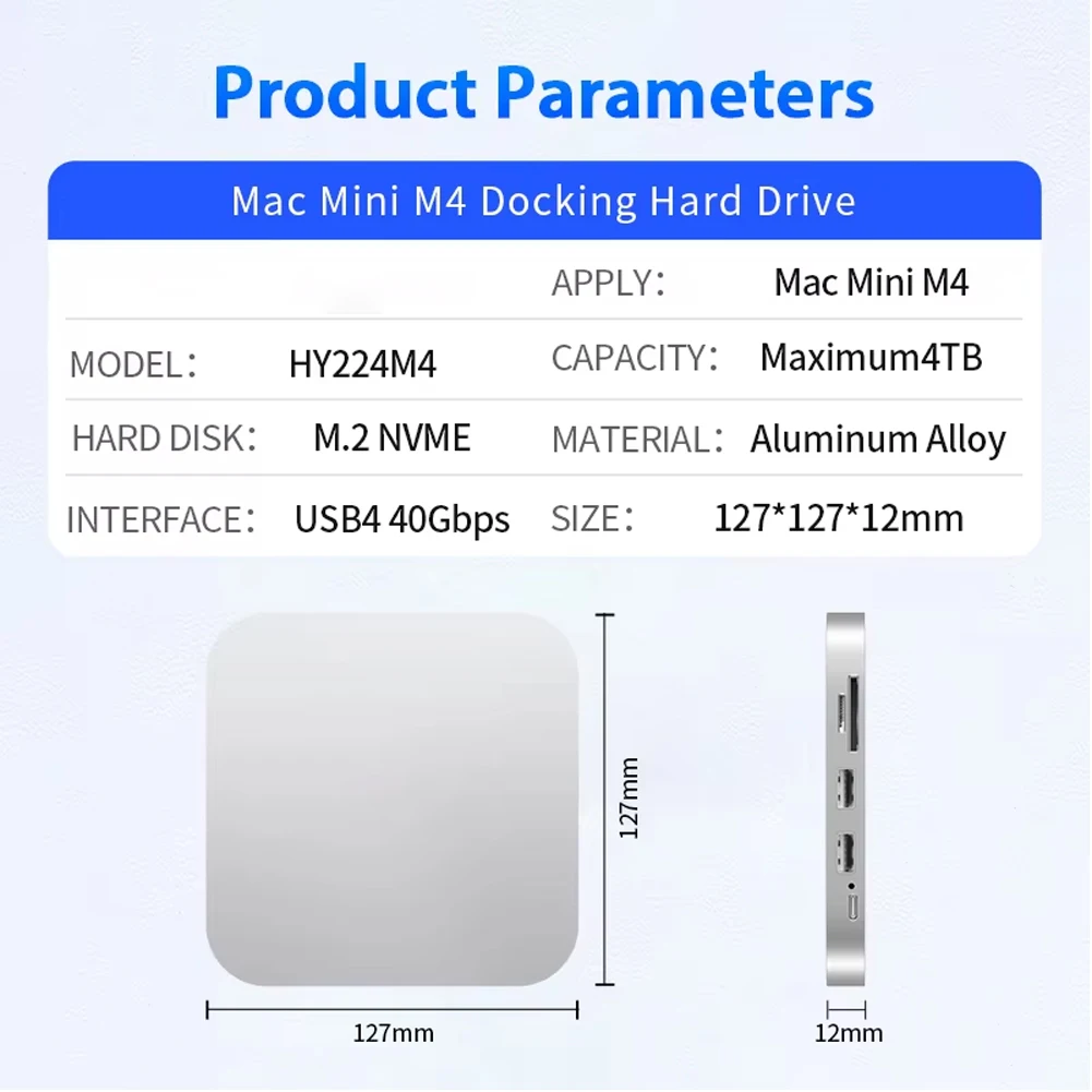Enhance your Mac Mini M4 or M4 Pro with this sleek USB C Hub featuring an integrated M.2 NVMe SSD enclosure. Crafted from durable CNC aluminum alloy with a lightweight, matte finish, this compact dock measures 127x127x12mm and supports high-capacity SSDs up to 4TB, optimized for PCIe 4.0 speeds up to 7000MB/s. It offers one USB4 port, two USB 2.0 ports, and dedicated SD and TF card slots, all delivering blazing fast data transfer speeds up to 40Gbps via USB 4.0. Easy to set up, it supplies power through a Type-C connection and is designed for efficient heat dissipation with vented fins, making it an ideal high-tech expansion for professional use.