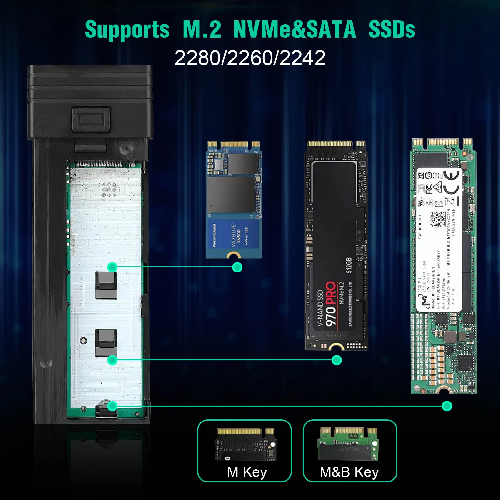- Supports M.2 PCIe NVMe and SATA SSDs with M Key or B+M Key, compatible with 2242, 2260, 2280 sizes for flexible storage options.