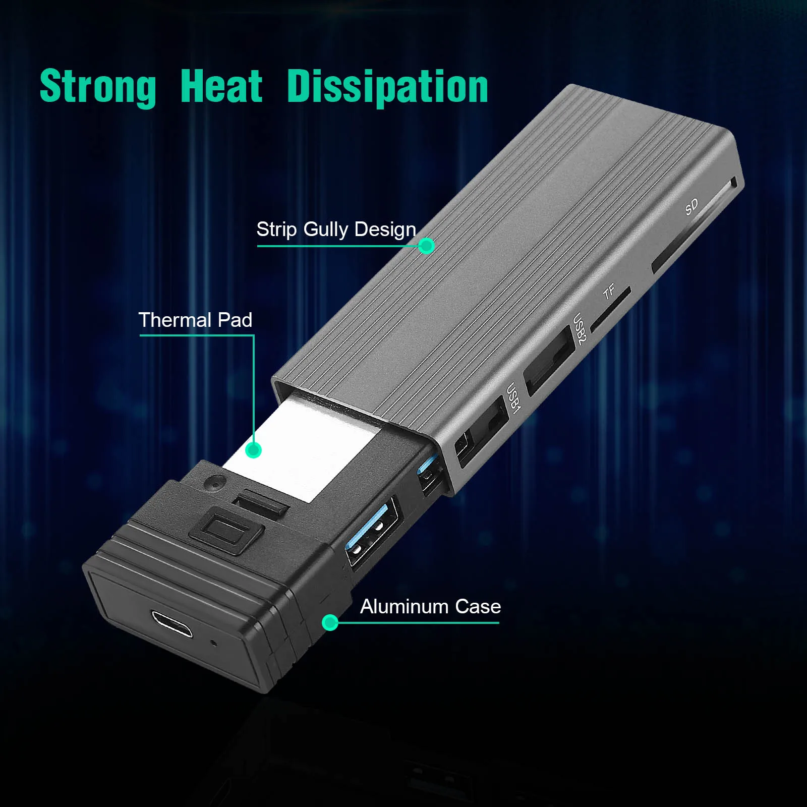 Experience efficient, stylish data management with this high-performance M.2 NVMe SSD enclosure. Crafted from durable aluminum alloy, its sleek black finish and textured ridged surface give it an industrial yet modern appeal. Designed for easy, tool-free installation, the sliding tray allows instant SSD access. Enhanced with a heat dissipation vest, it effectively cools your drives, increasing cooling efficiency by 20%. Its compact 1.8-inch size seamlessly fits into any workspace or travel setup. Compatible with 2242, 2260, and 2280 SSDs, supporting up to 2TB capacity, it offers blazing-fast data transfer speeds of up to 10Gbps over USB 3.1 Gen2. Its versatile ports include USB-C, two USB 2.0, and SD/TF card readers, making it indispensable for professionals and enthusiasts alike.